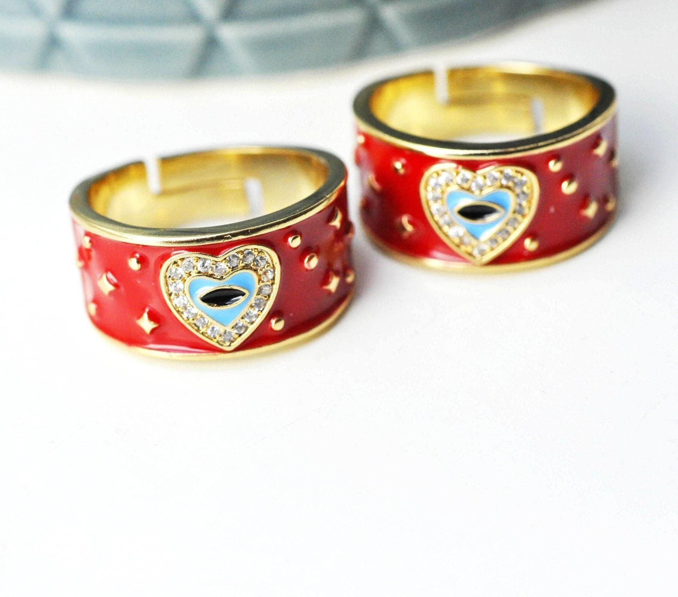 Adjustable ring in gold-plated brass with red enamel and protective eye, jewelry creation, women's ring, birthday gift, 18mm, unit A very beautiful ring holder in enameled gold-plated brass, decorated with a protective heart-shaped eye and zircons. We love this ring...