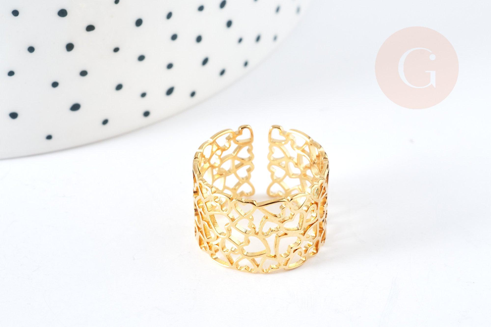 Bague réglable large coeurs acier doré 304 inoxydable IP taille 54, x1 (G8461)
