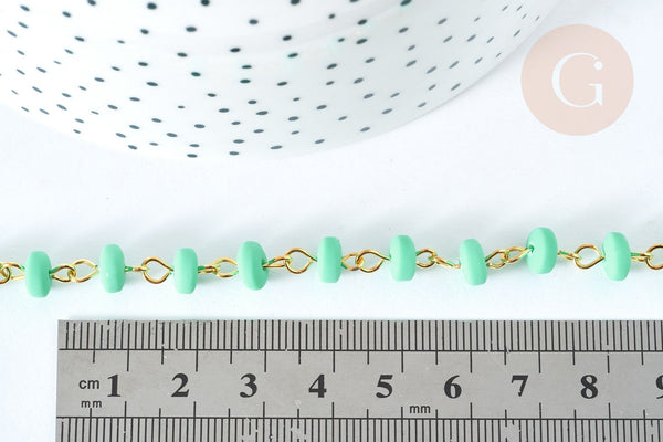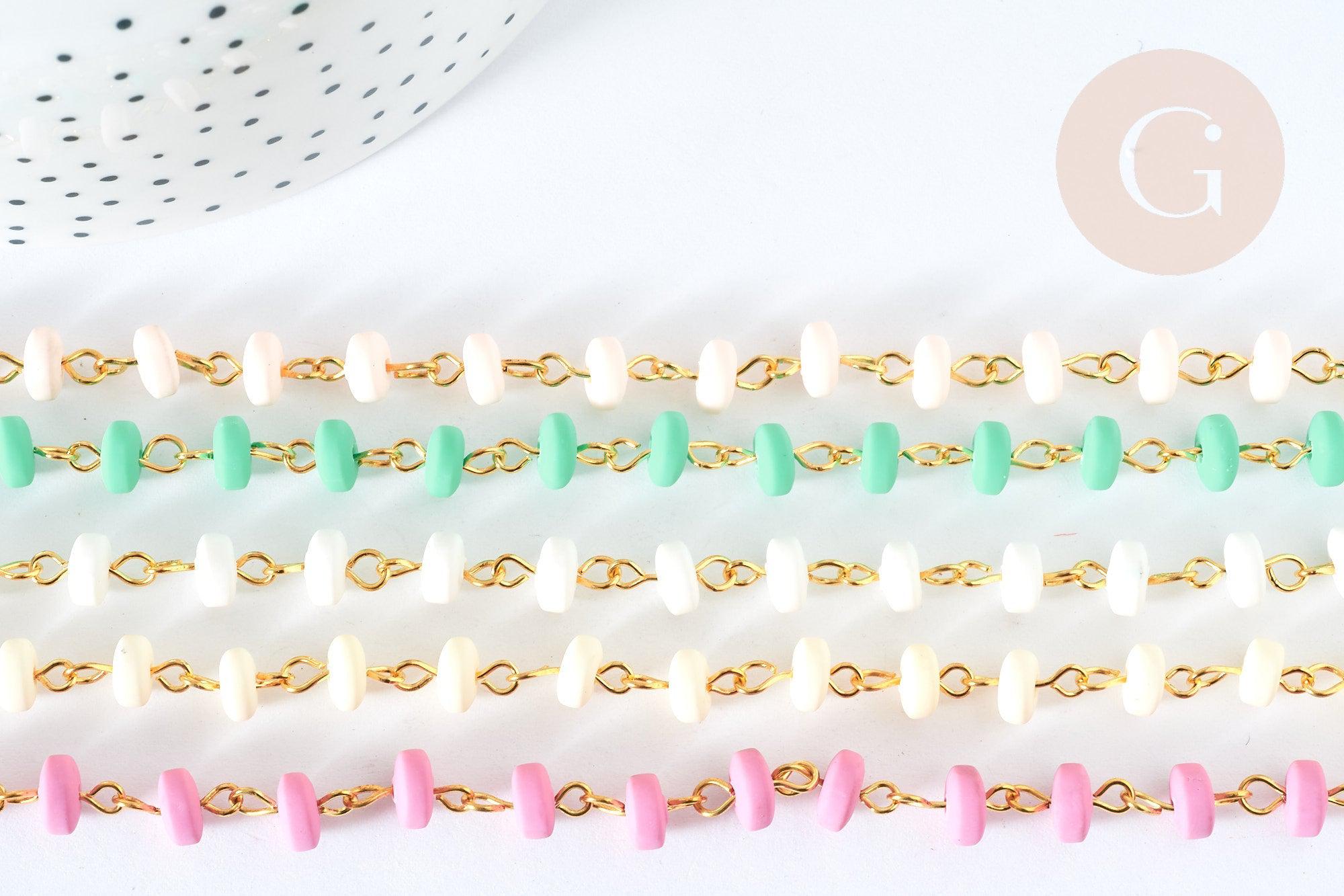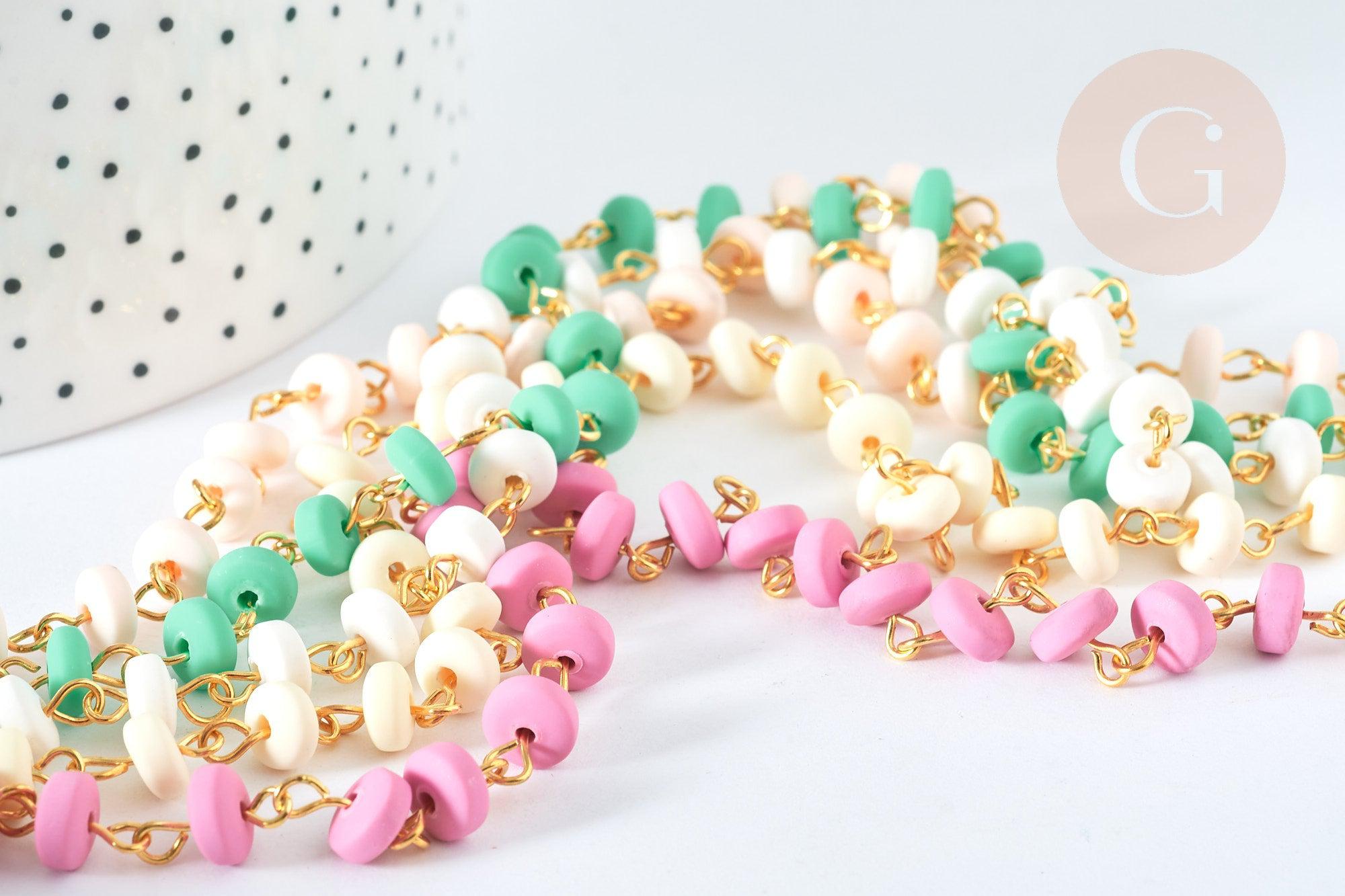 Adopt this gold-plated iron chain , sold by the meter. It is composed of disc-shaped beads in a mixed pastel color. Ideal for adding softness to your life!