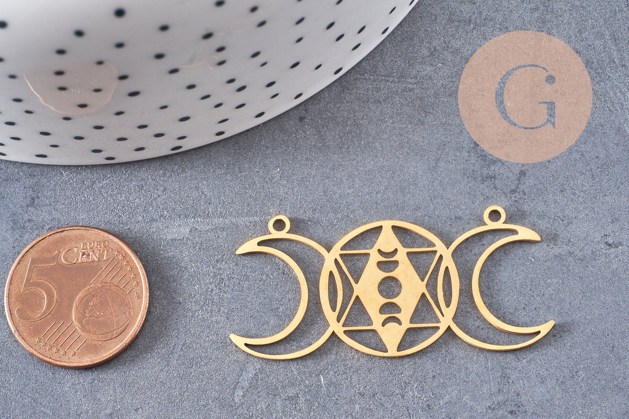 Gold-plated steel pendant with geometric moons, gold-plated charm, gold-plated stainless steel, nickel-free pendant, jewelry creation, 47mm, x1 G5695