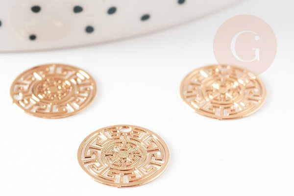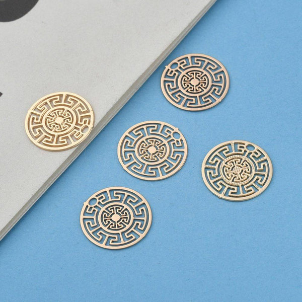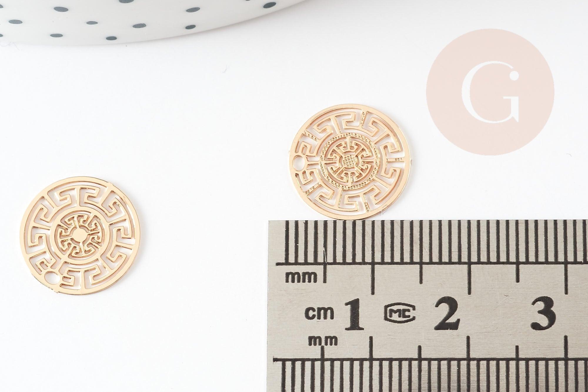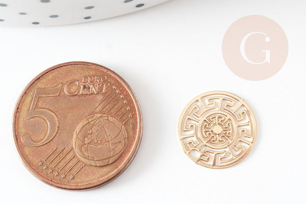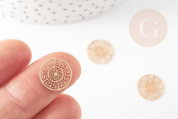Round Aztec filigree print pendant in gold-plated brass, Very fine and light pendant for jewelry creation, 13mm, Set of 2