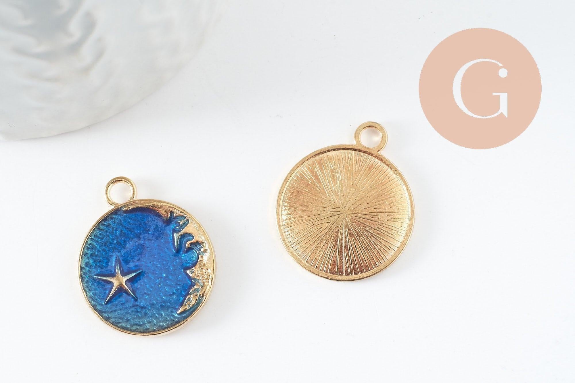 Round moon stars medal pendant in blue enamel, gold-plated zamac, 25mm, enamelled brass pendant, nickel-free, x1 (G5838)