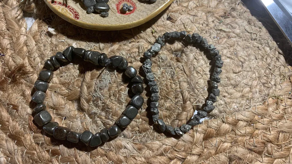A strand of rolled pyrite nugget beads in metallic and shiny shades.