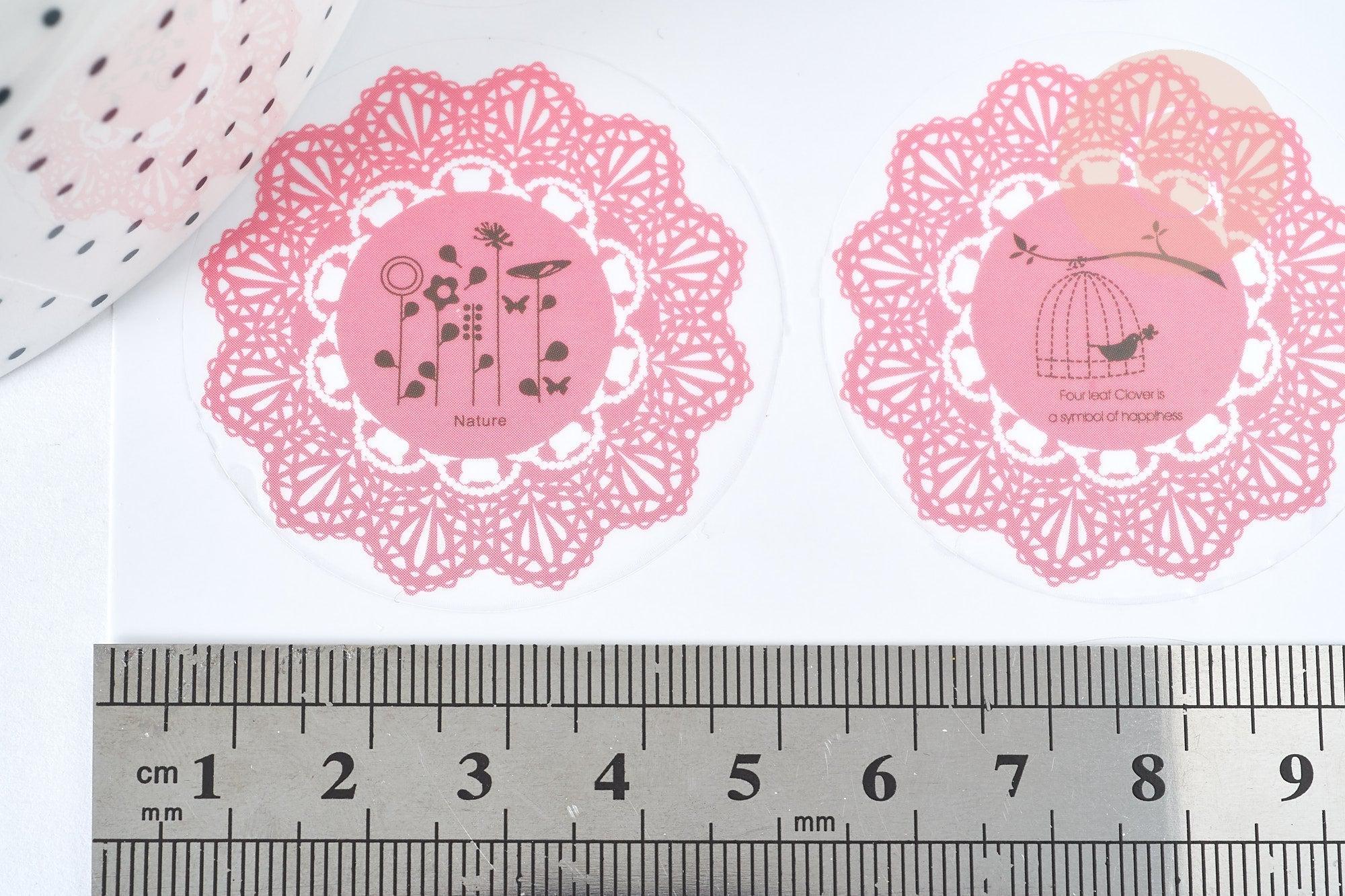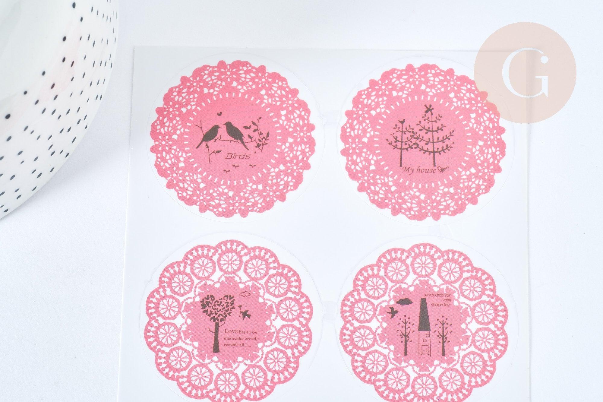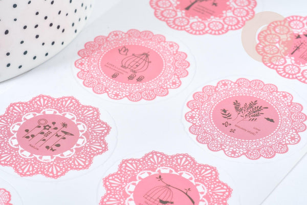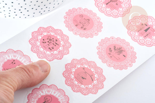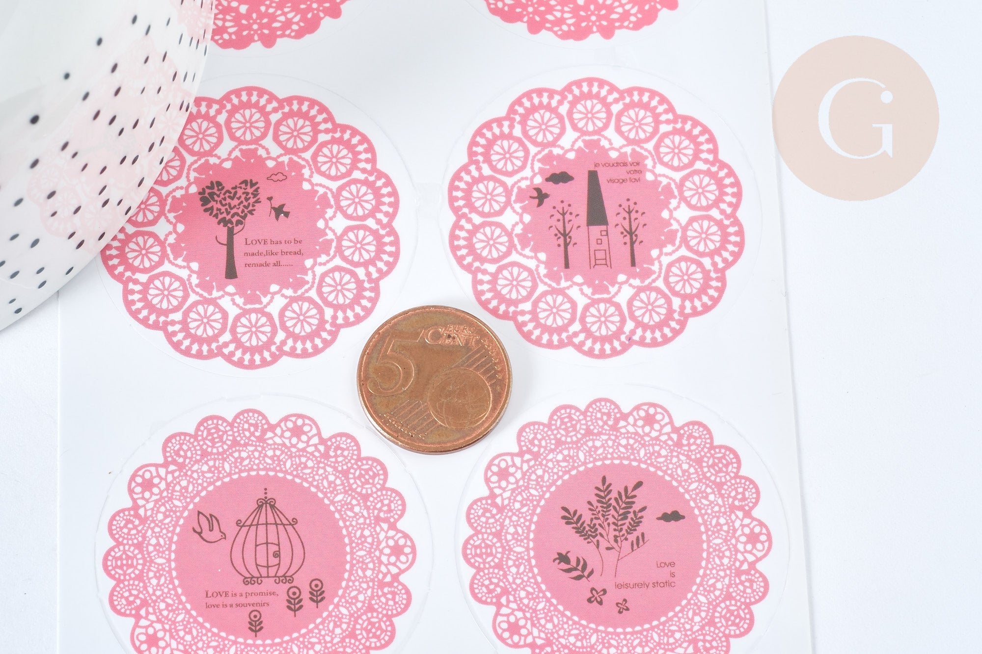 Fall for these round pink stickers in the shape of a lace macaroon, as a thank you or for party decoration or your small wedding gifts.