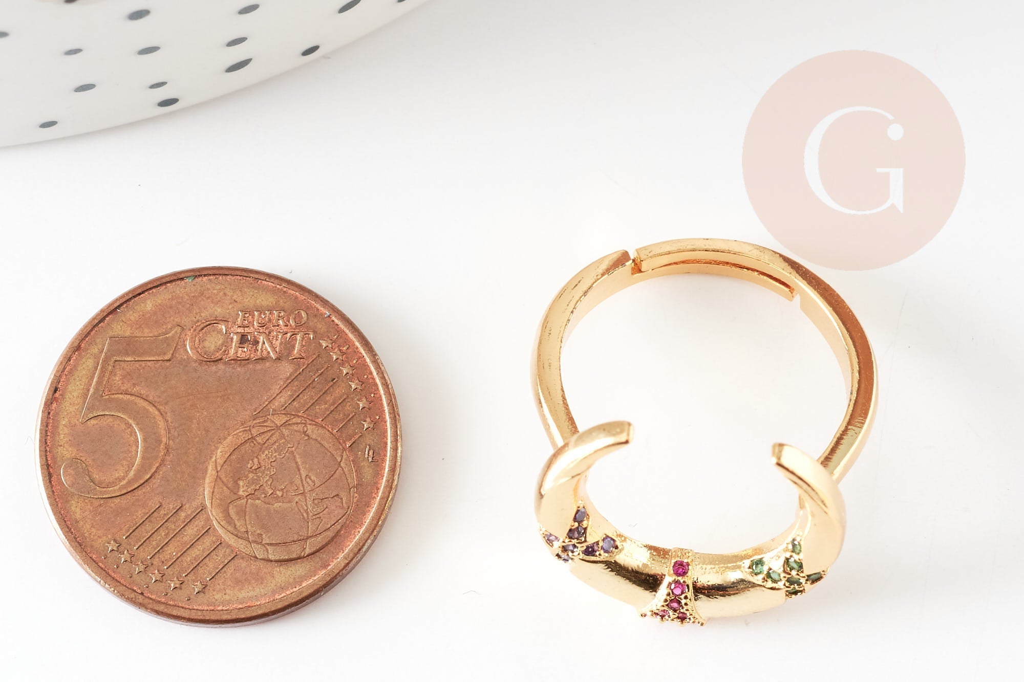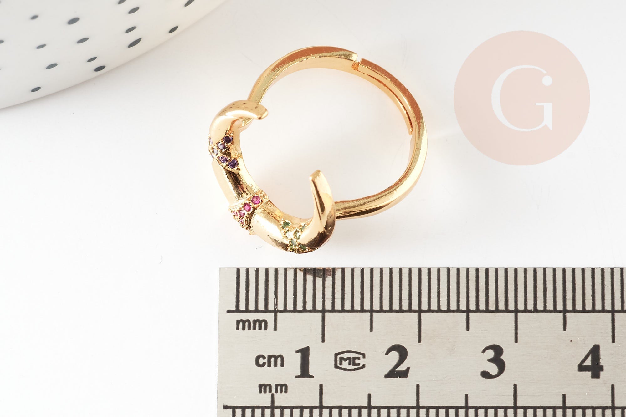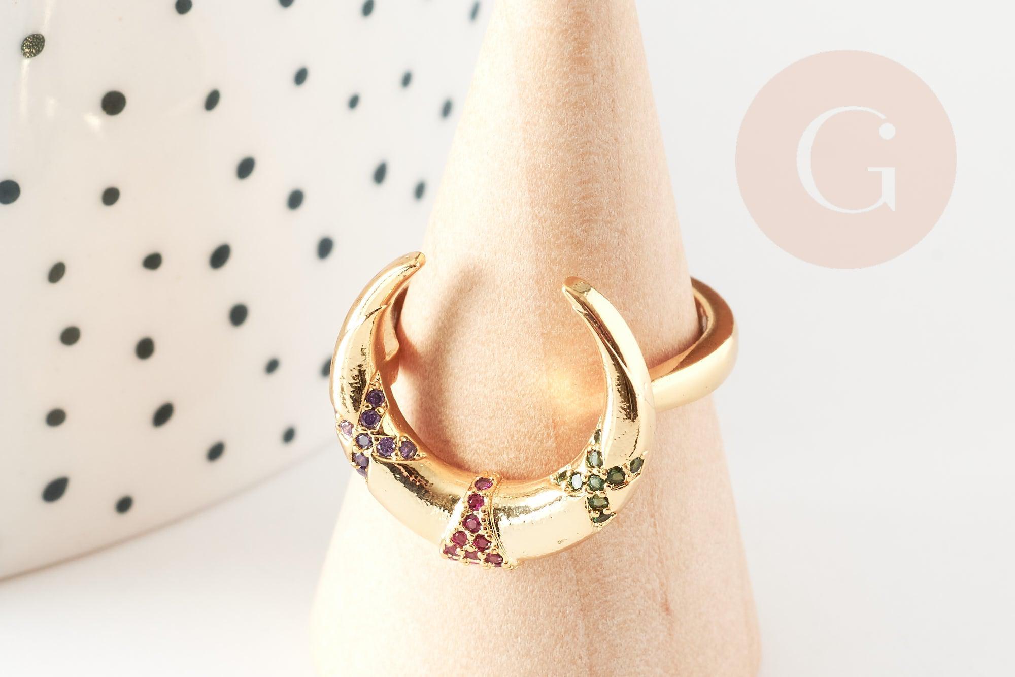Gold-plated brass ring with colored zircon moon, jewelry creation, women's ring birthday gift, gold-plated brass ring holder, 16.5mm, unit
