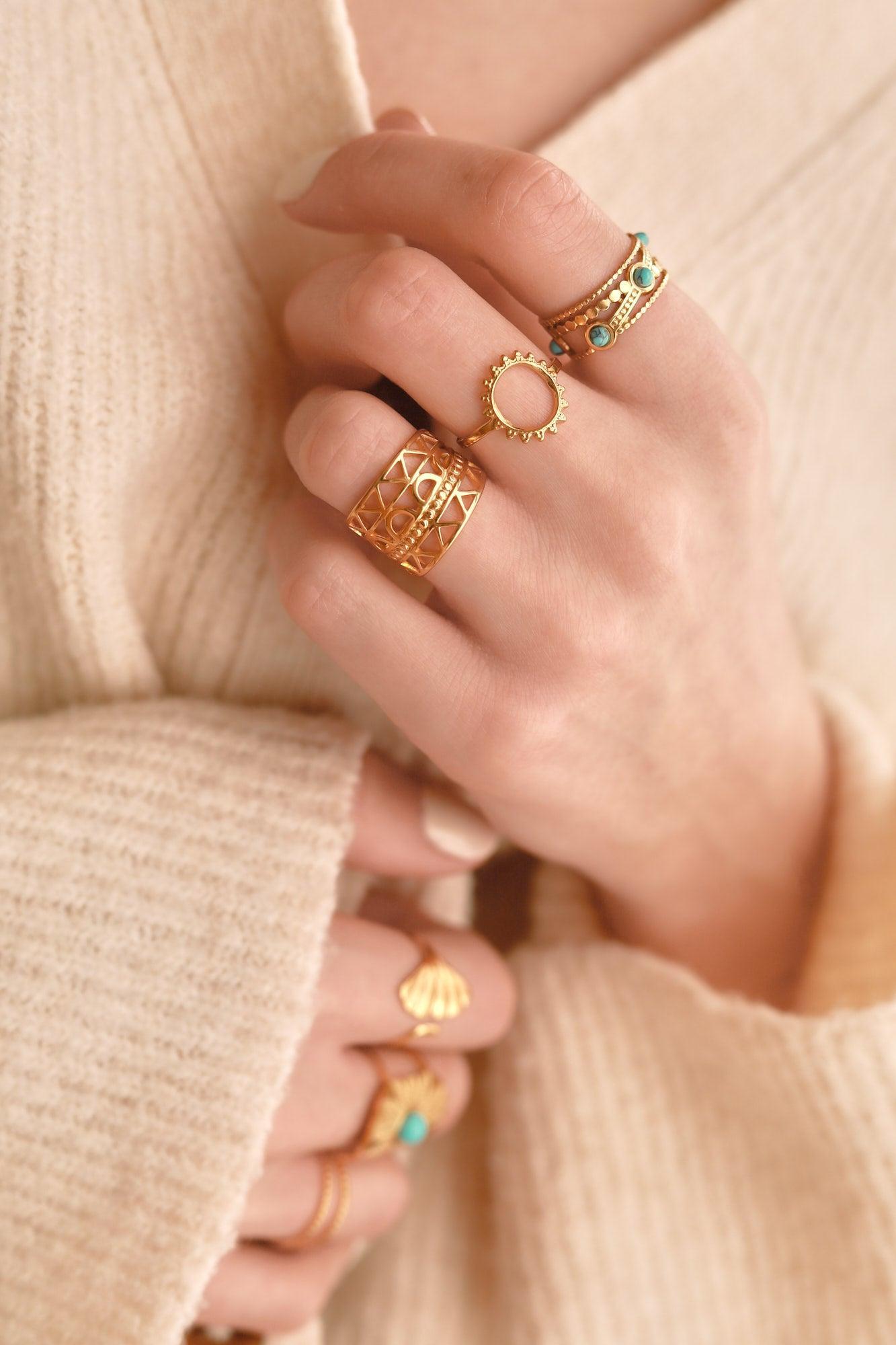 This gold-plated steel ring is a timeless and very chic piece of jewelry for women. The unique design of this ring is made up of 3 intertwined rings in gold-plated stainless steel and decorated with 3 synthetic turquoise stones.