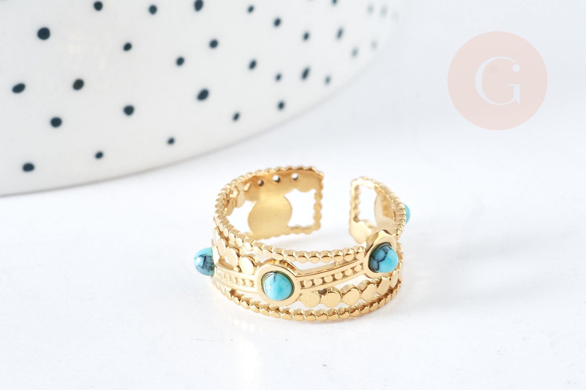 Bague réglable dentelle pierre turquoise synthèse acier doré Taille 54, x1 (G7638)