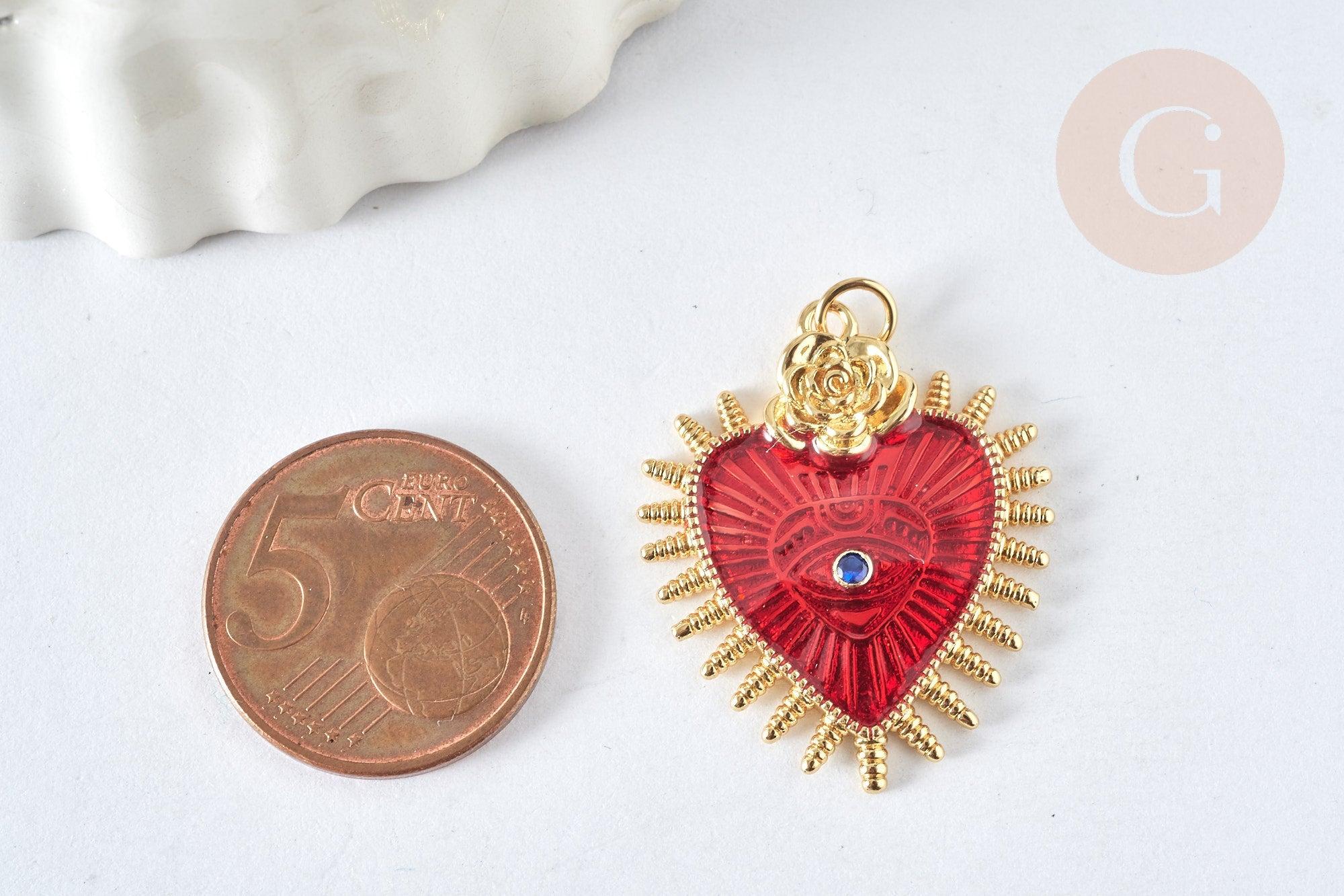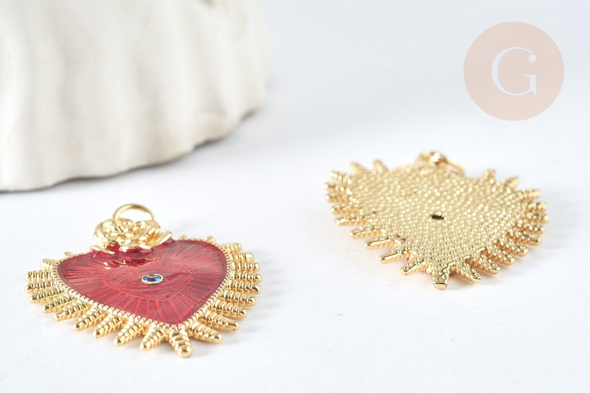 Pendentif Cœur mauvais œil émail rouge foncé laiton doré 30mm, Pendentif chance, x1 G8407