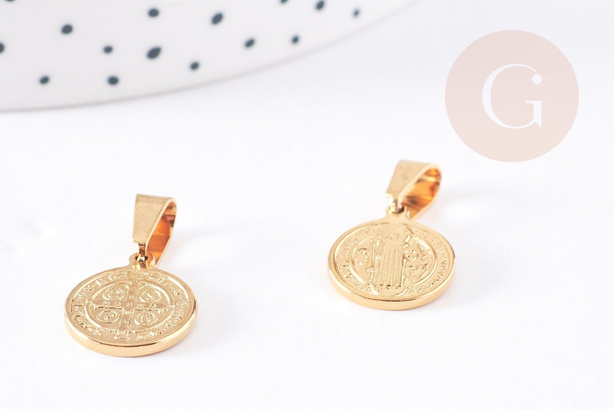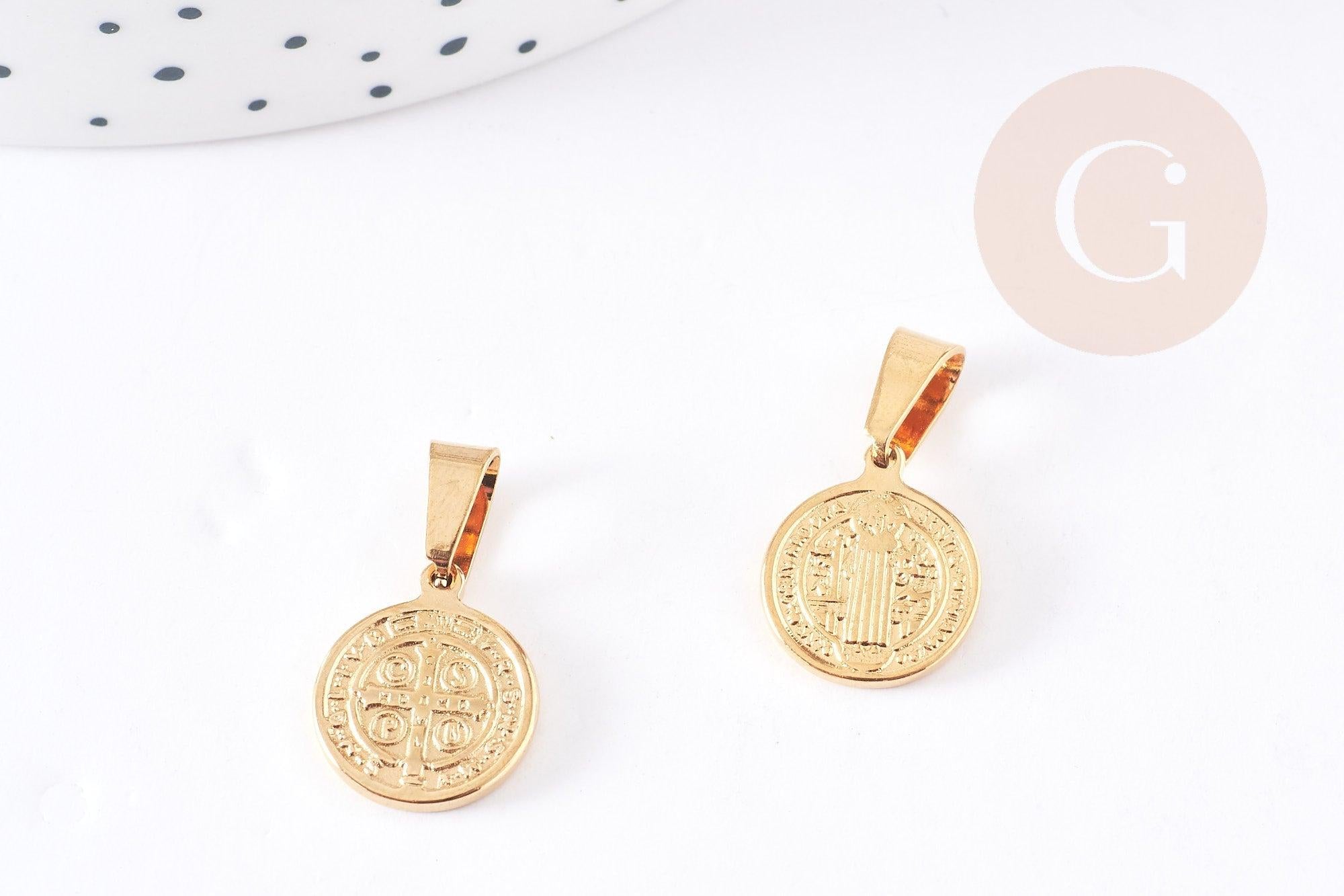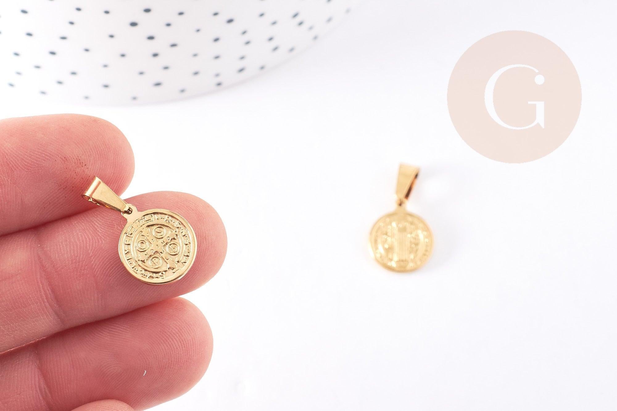 Round Saint Benedict medal pendant in gold-plated steel, gold-plated pendant, nickel-free, gold-plated steel, religious medal, gold medal, 15mm