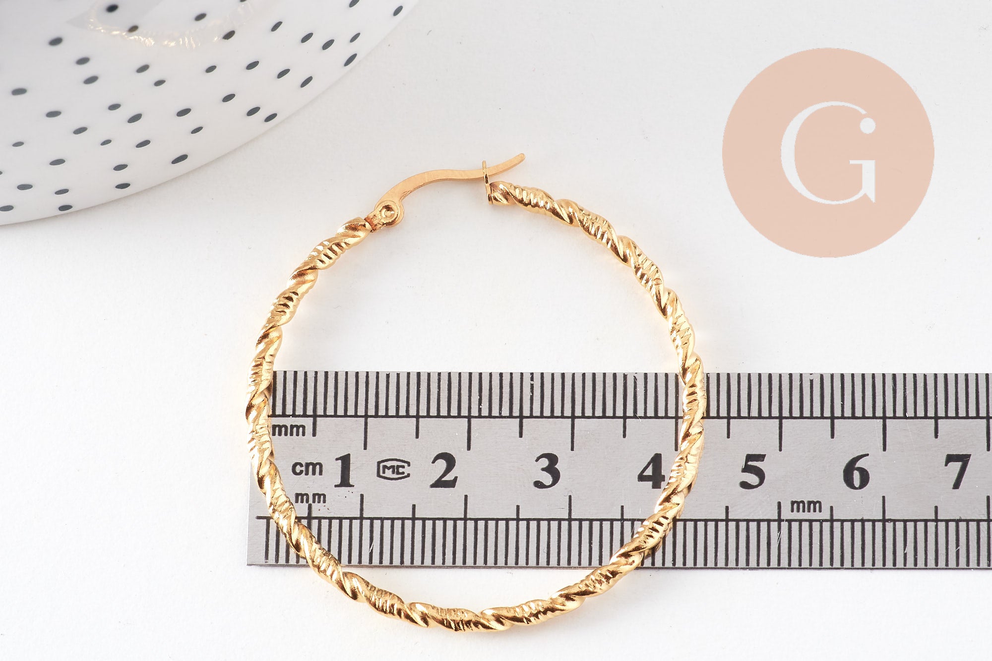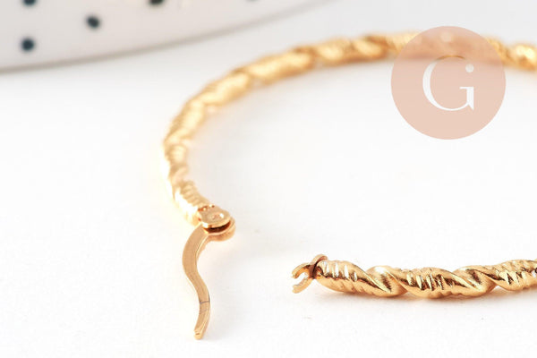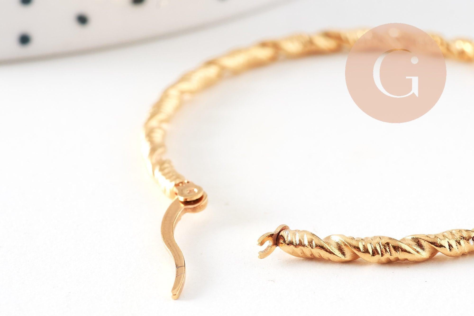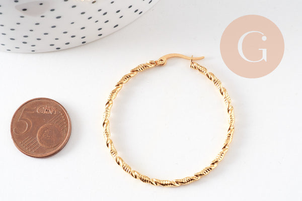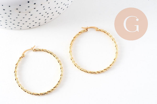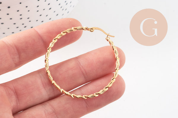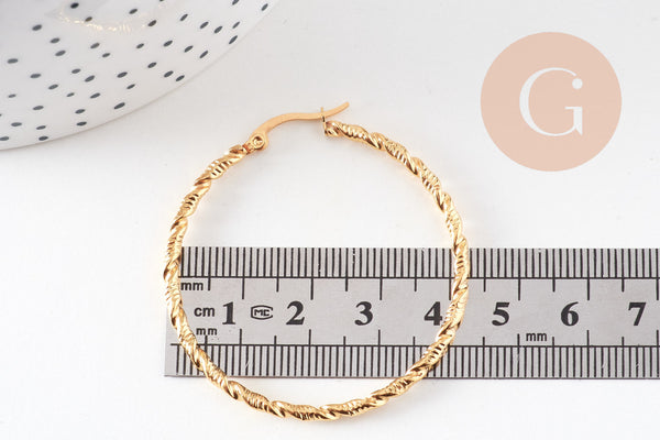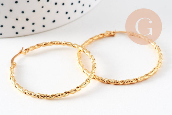 twisted gold-plated steel hoop earrings, gold-plated jewelry, creative supplies, jewelry creation, pierced ear, nickel-free, pair, steel earrings, 45mm