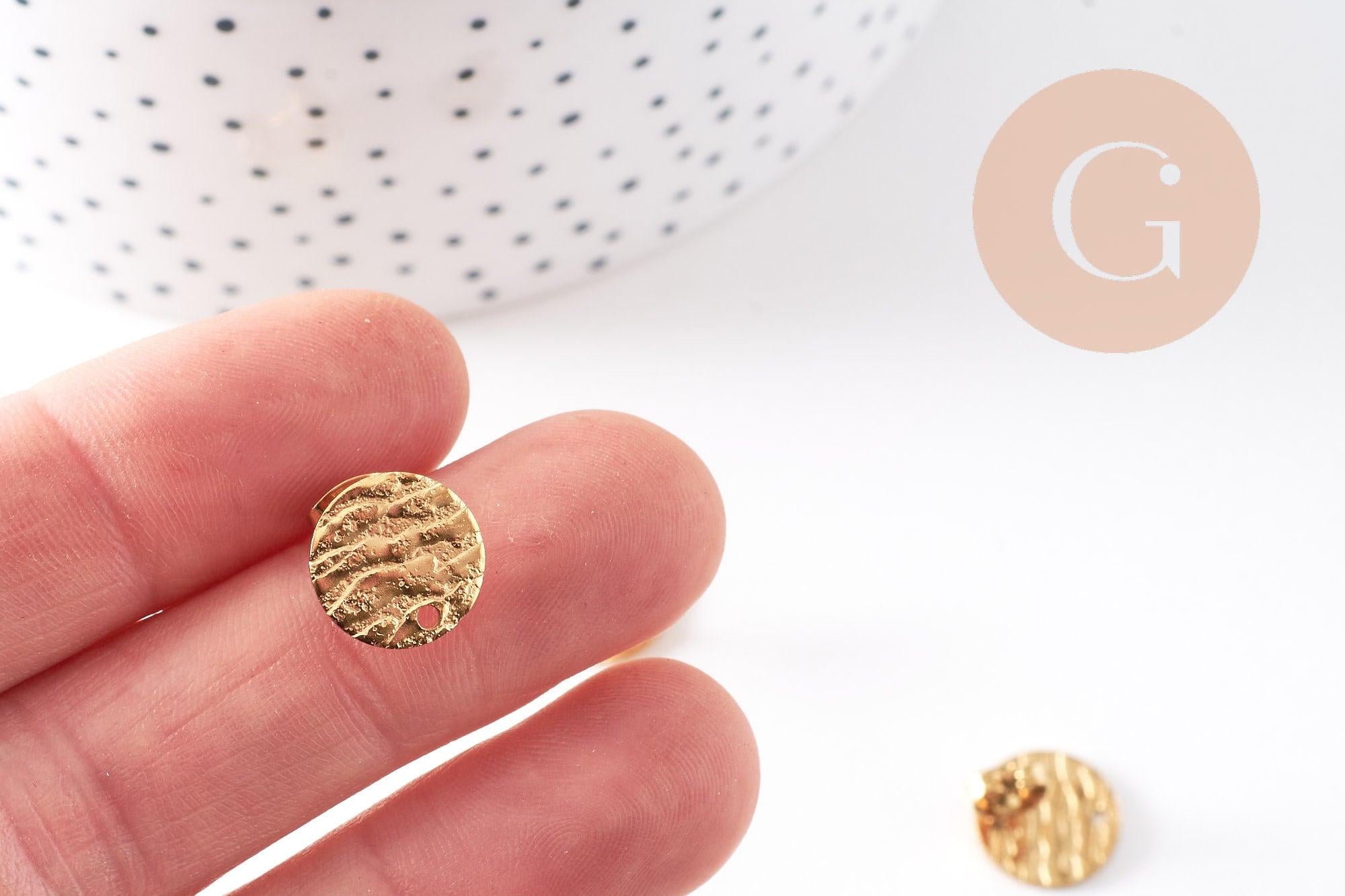 Clous-puces oreille disque acier 304 inoxydable dore IP texturé 1 trou 12mm, la paire (G10488)