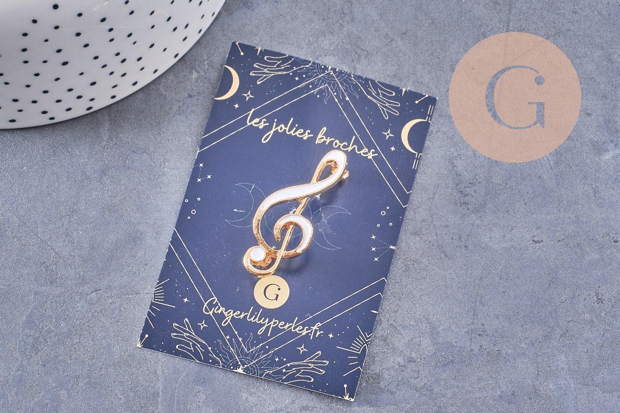 This gold-plated zamak treble clef brooch with white enamel measures 39mm and is an elegant and original accessory for music lovers.