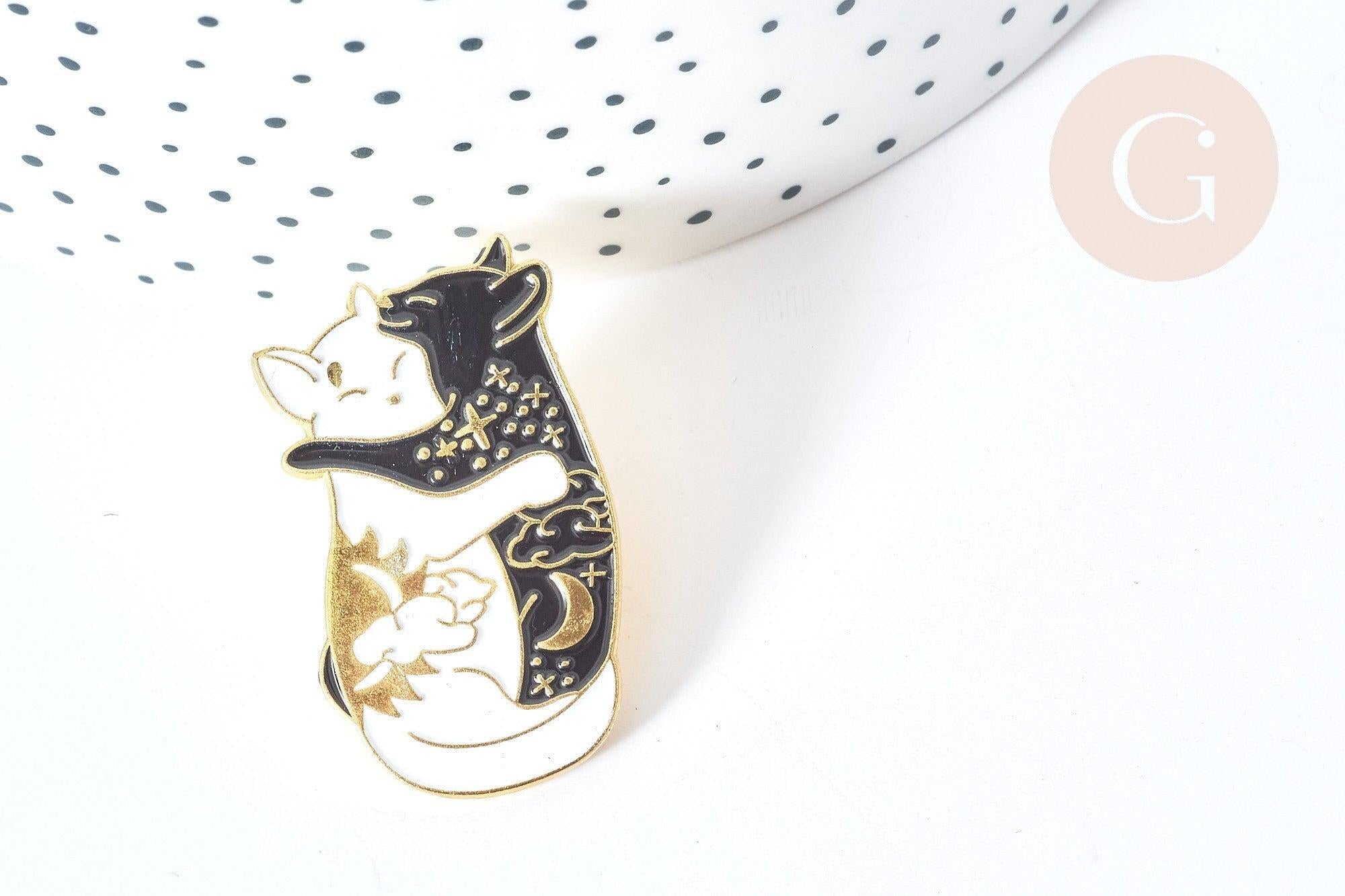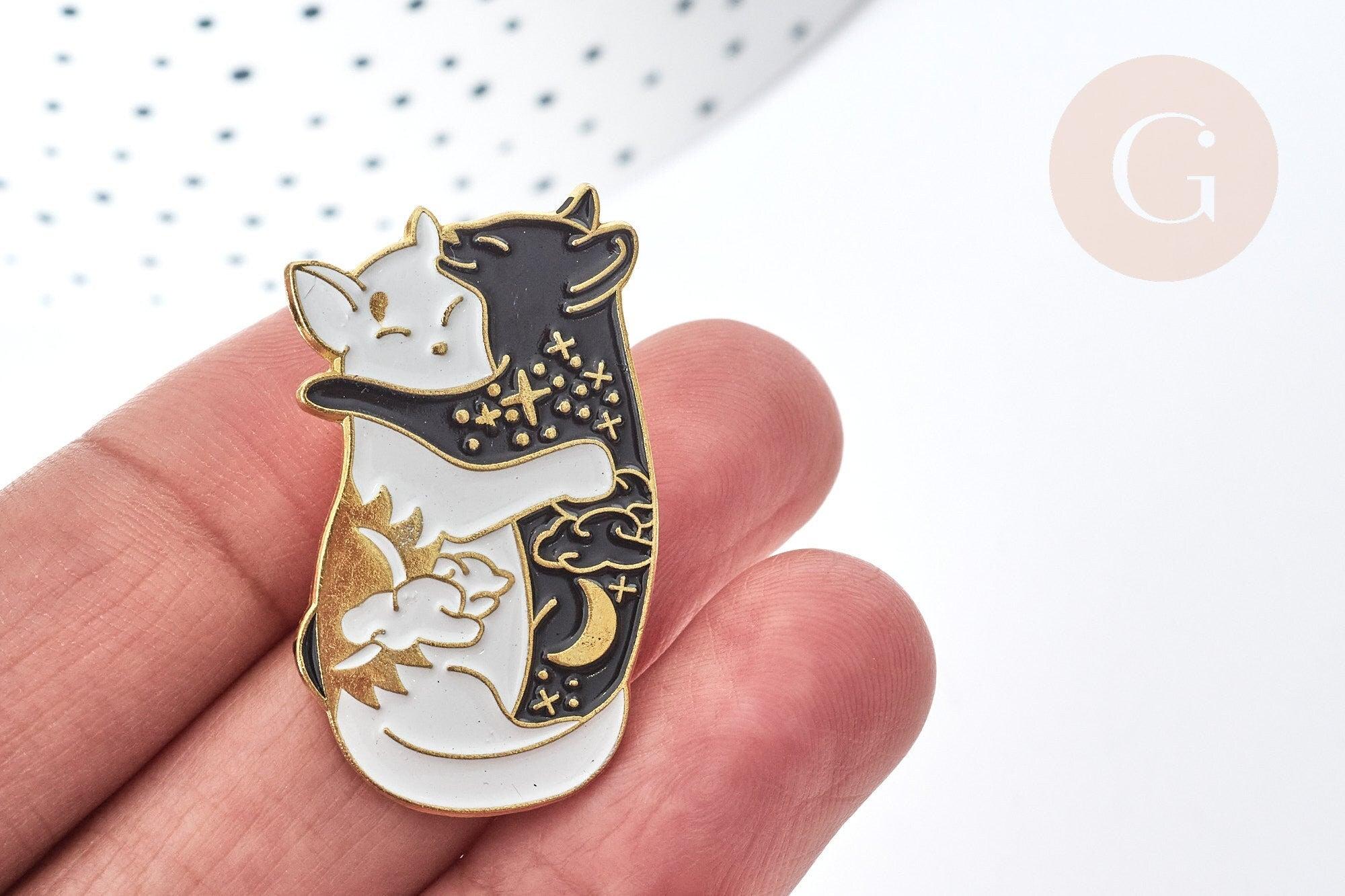We offer you this charming brooch depicting two cats, made of gold-plated zamak with black and white enamel. It also has several motifs: the sun in white and the moon in black.