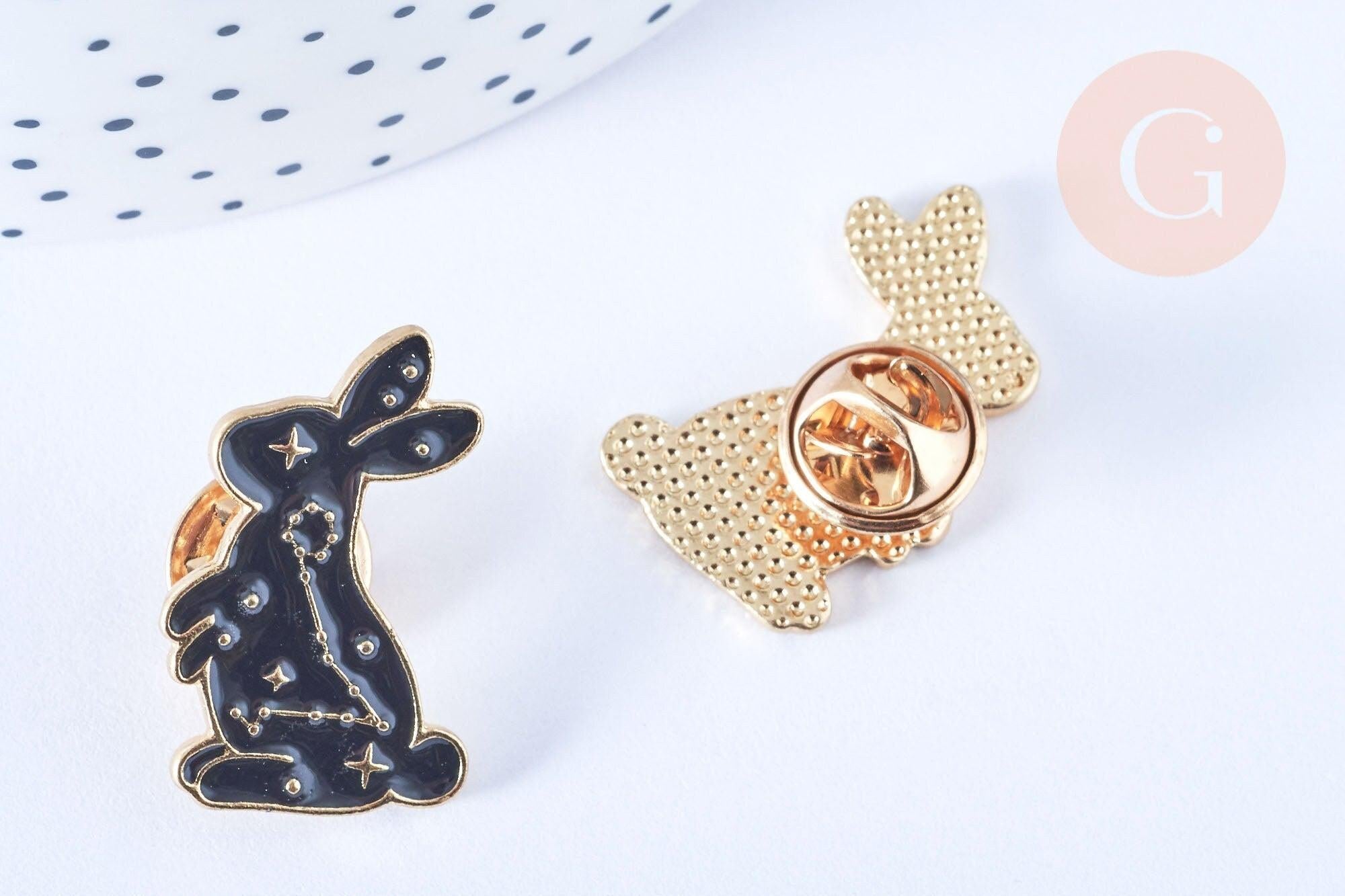 We offer you this delightful brooch / Pin representing a cute rabbit decorated with a black mystical pattern with a starry background, in gold zamac and colored enamel.