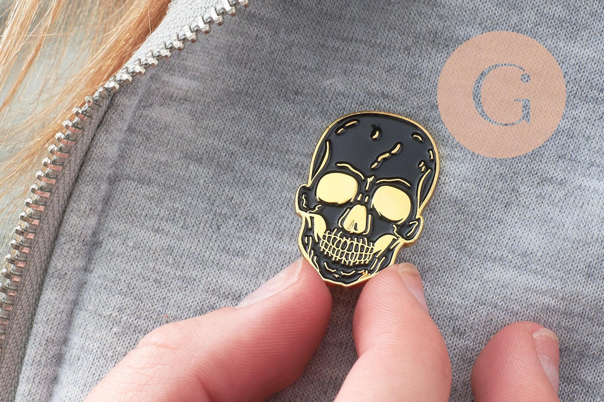 The Mystical Skull Pin Brooch Gold Black Enamel is an elegant and mysterious fashion accessory that can be used in different ways to personalize your clothing style. Here are three ways to use it: