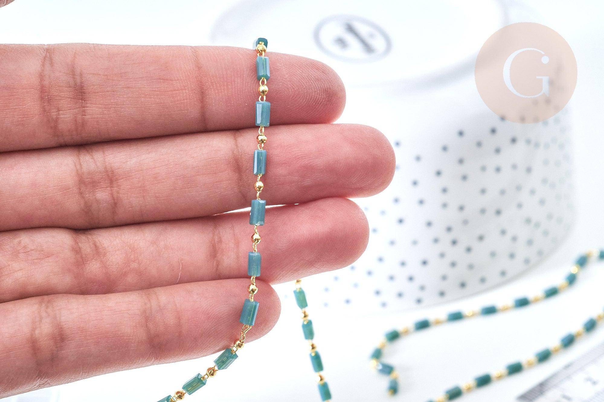 Adopt this golden chain composed of ocean green faceted rectangular tube glass beads. Ideal for adding vitamin to your DIY costume jewelry !