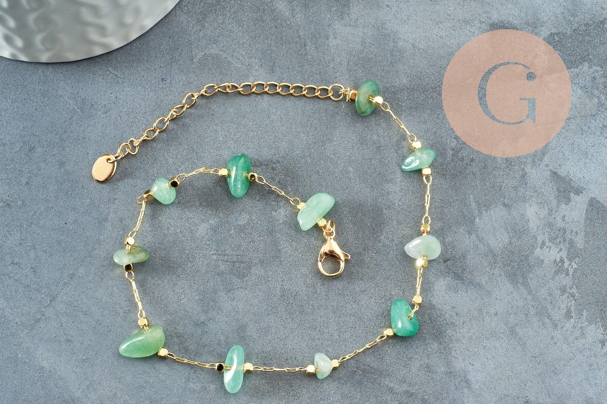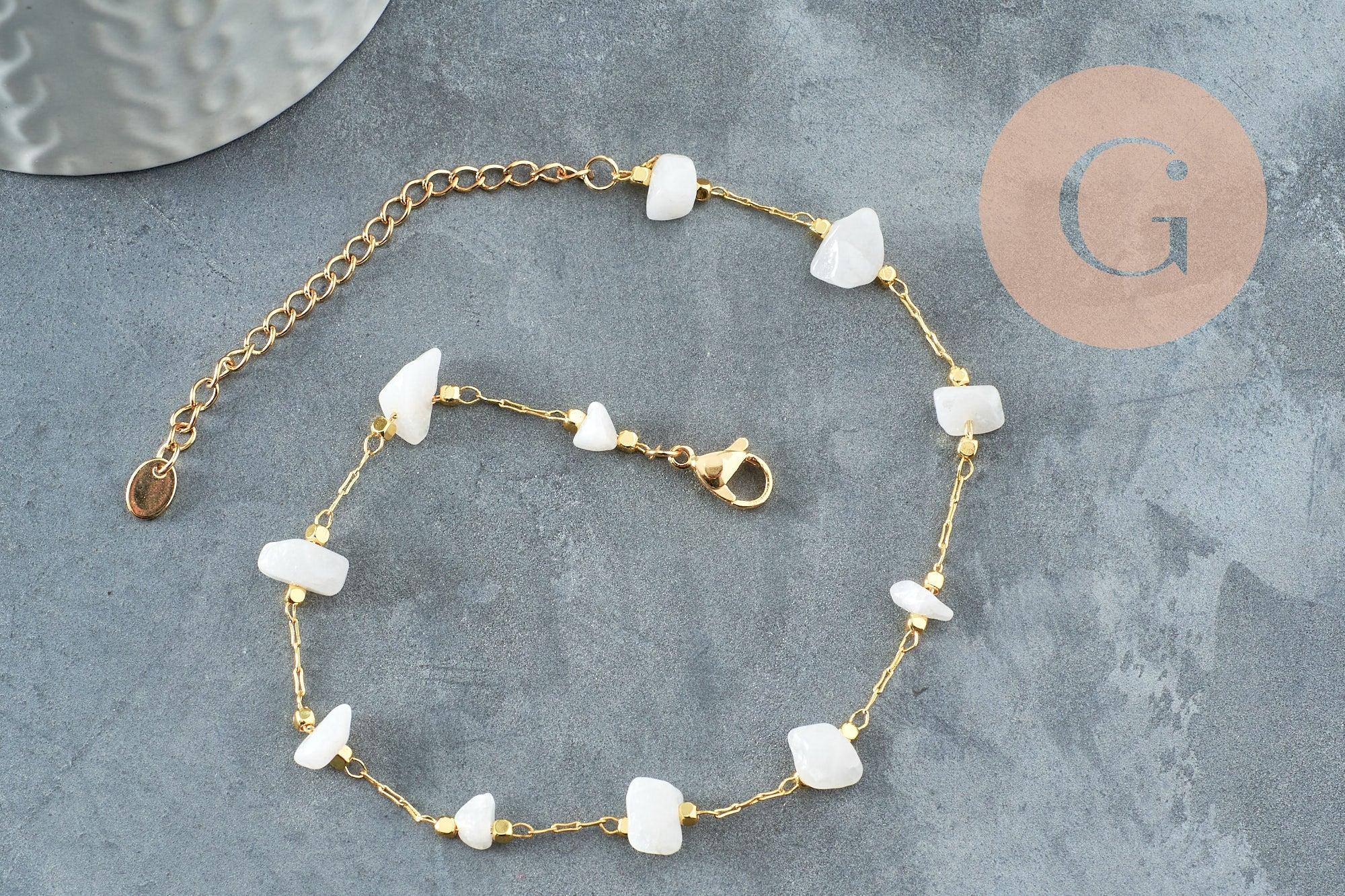 Let yourself be seduced by this adjustable ankle chain with natural agate charms tinted in golden brass and 304 golden stainless steel clasp . This one is already equipped with a carabiner for easy attachment. Put it on your ankle and easily match it with all your outfits.