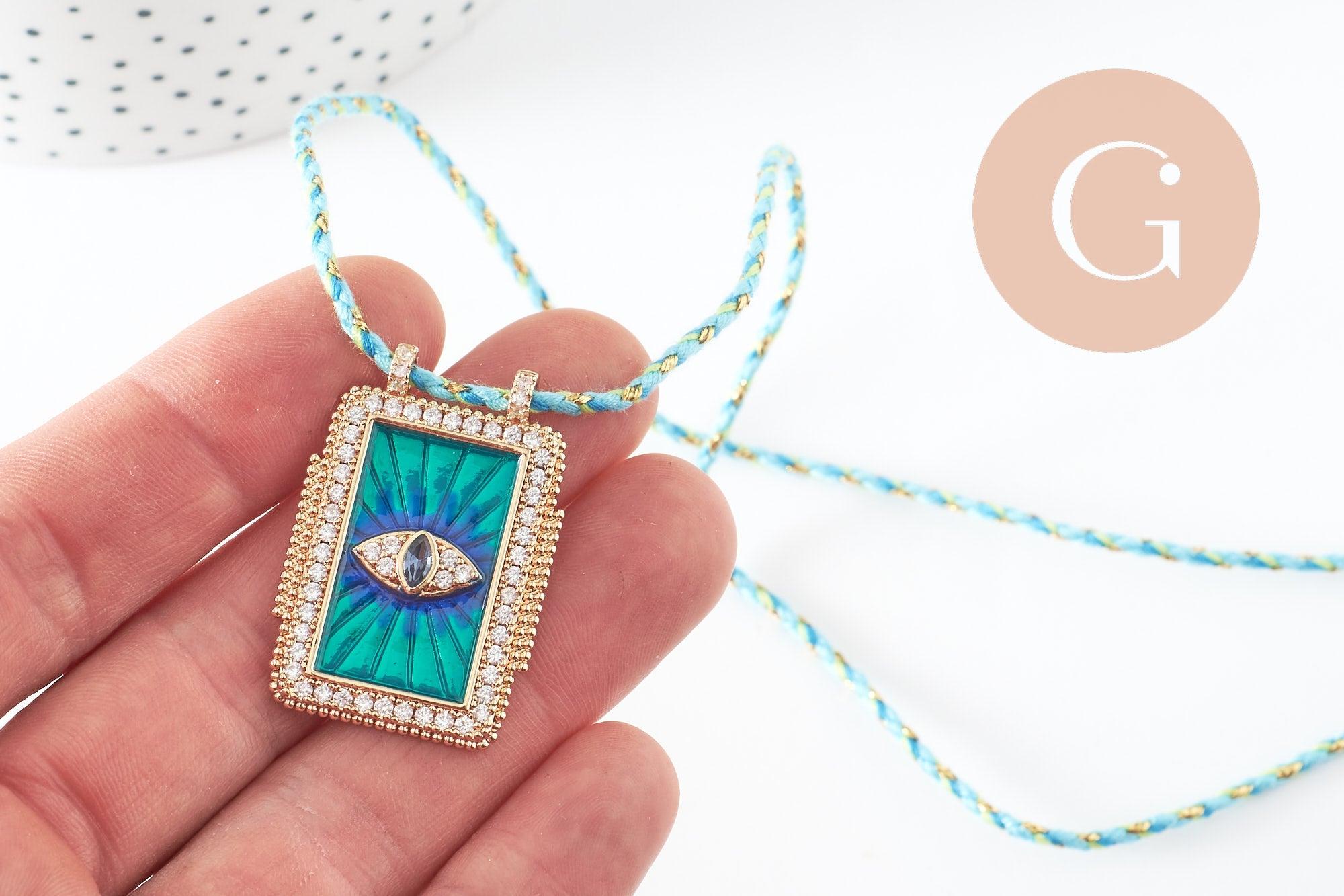 A necklace with an enamelled medal decorated with an eye with zircons, on a delicate coloured braided cord. Enameled in blue, this very trendy necklace will make an impact! A nice gift to give (to yourself). Length: 45cm (without extension...