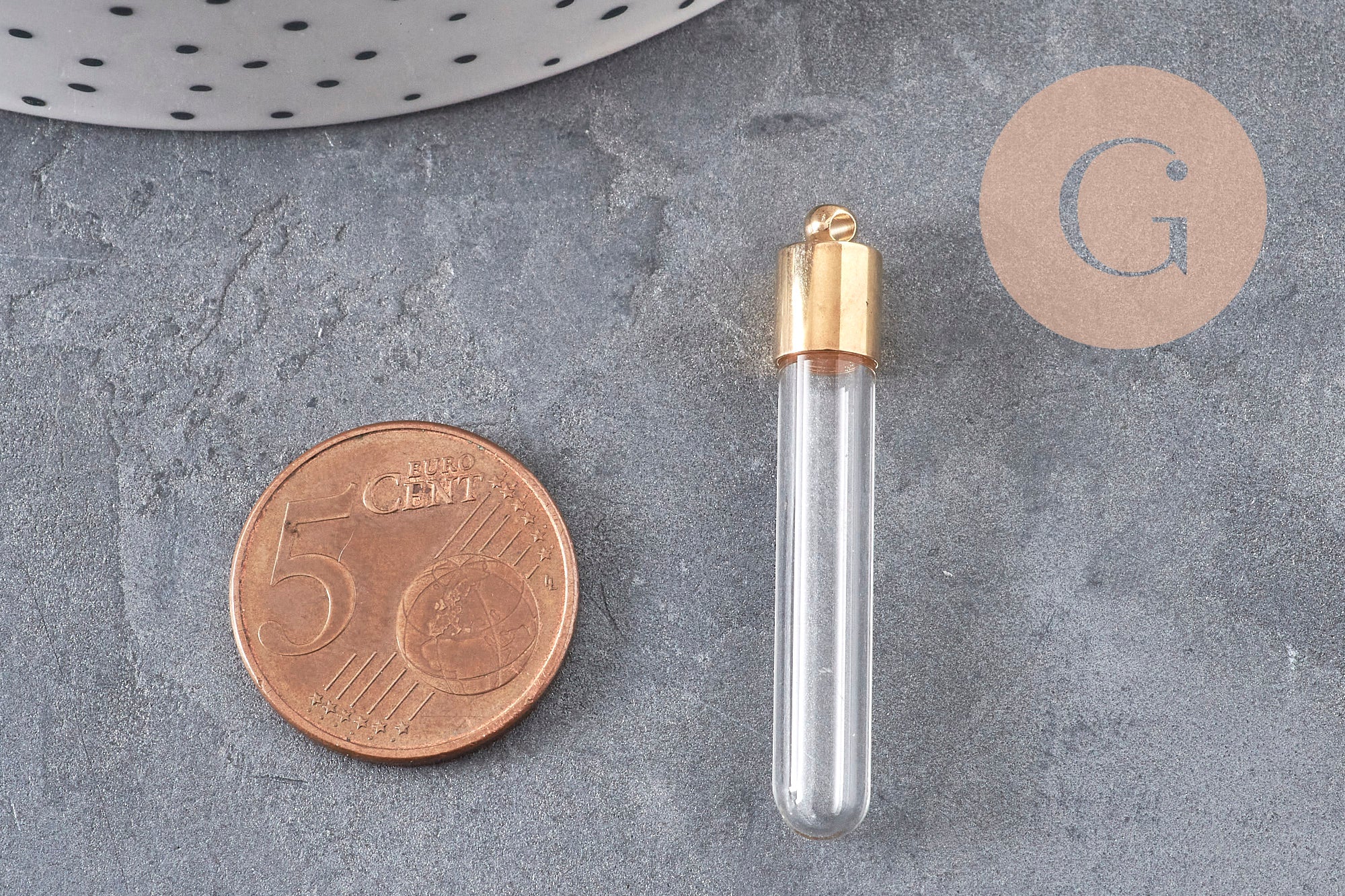 This glass bottle pendant with a gold-plated iron stopper is perfect for creating poetic, symbolic, and personalized DIY jewelry. Slender and elongated, this small, clear glass bottle can be filled as you wish to create a unique piece of jewelry, imbued with emotion or meaning.