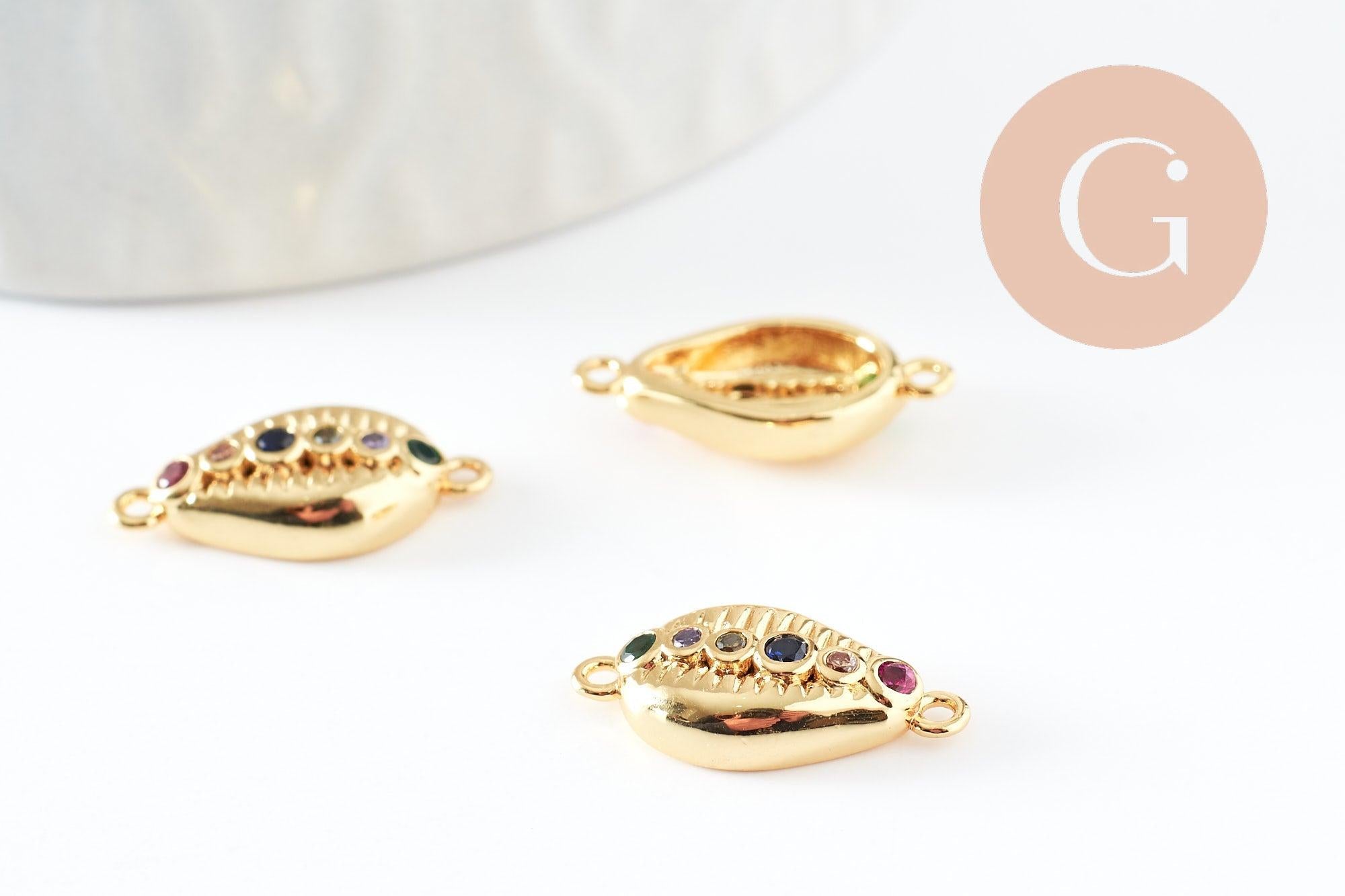 Cowrie pendant in golden brass with colorful zircons, shell pendant, jewelry creation, golden shell pendant, 15mm, each