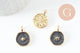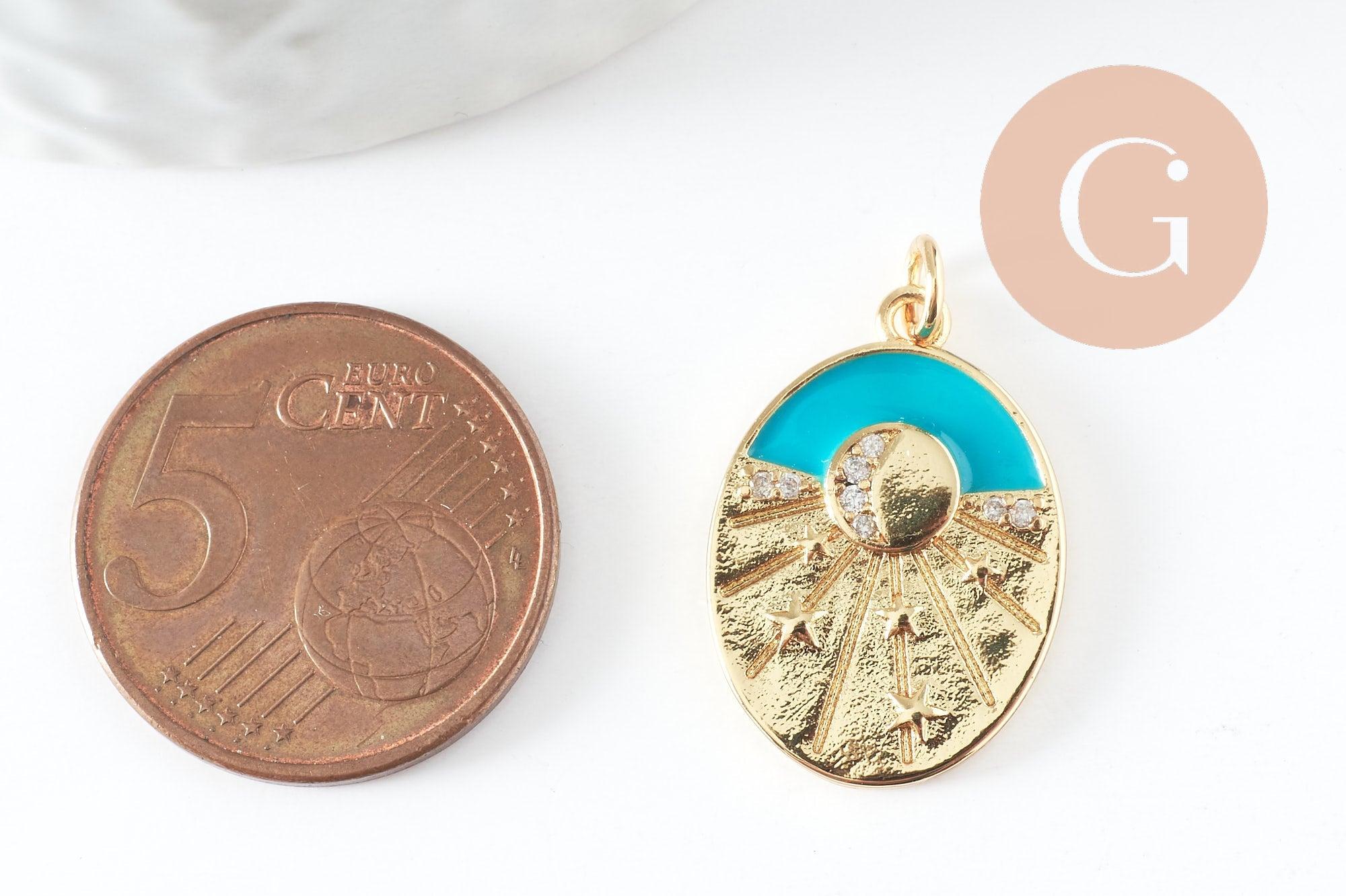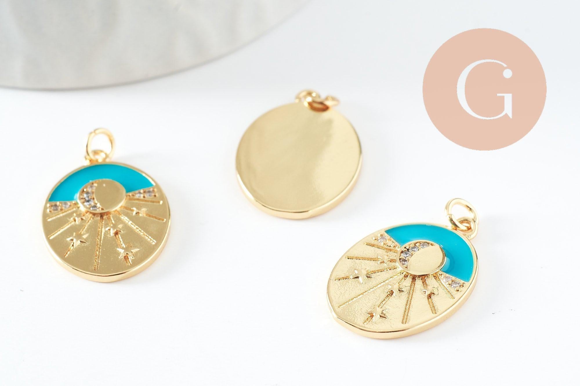 Oval sun moon turquoise enamel gold brass medal pendant, enameled brass pendant, nickel free, 22mm, each