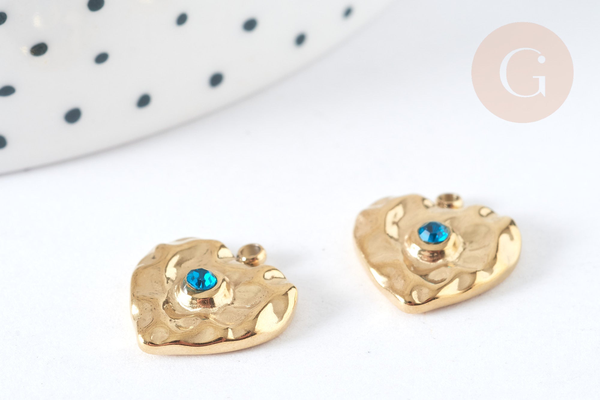 A heart pendant , hammered and made of gold-plated 304 stainless steel . In the center is a faceted blue zircon that shines!