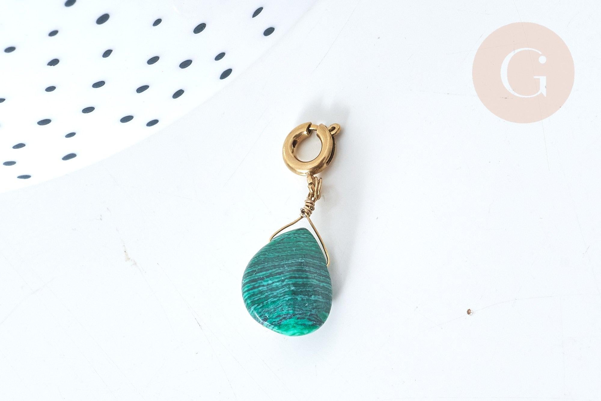 We love this synthetic malachite amulet pendant to create jewelry in the natural stone trend. It is decorated with a small golden element which gives it a mystical and original appearance.