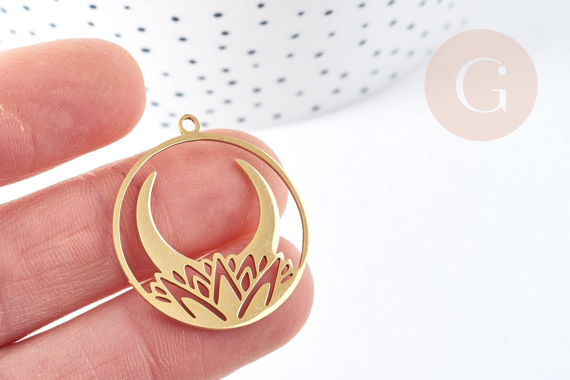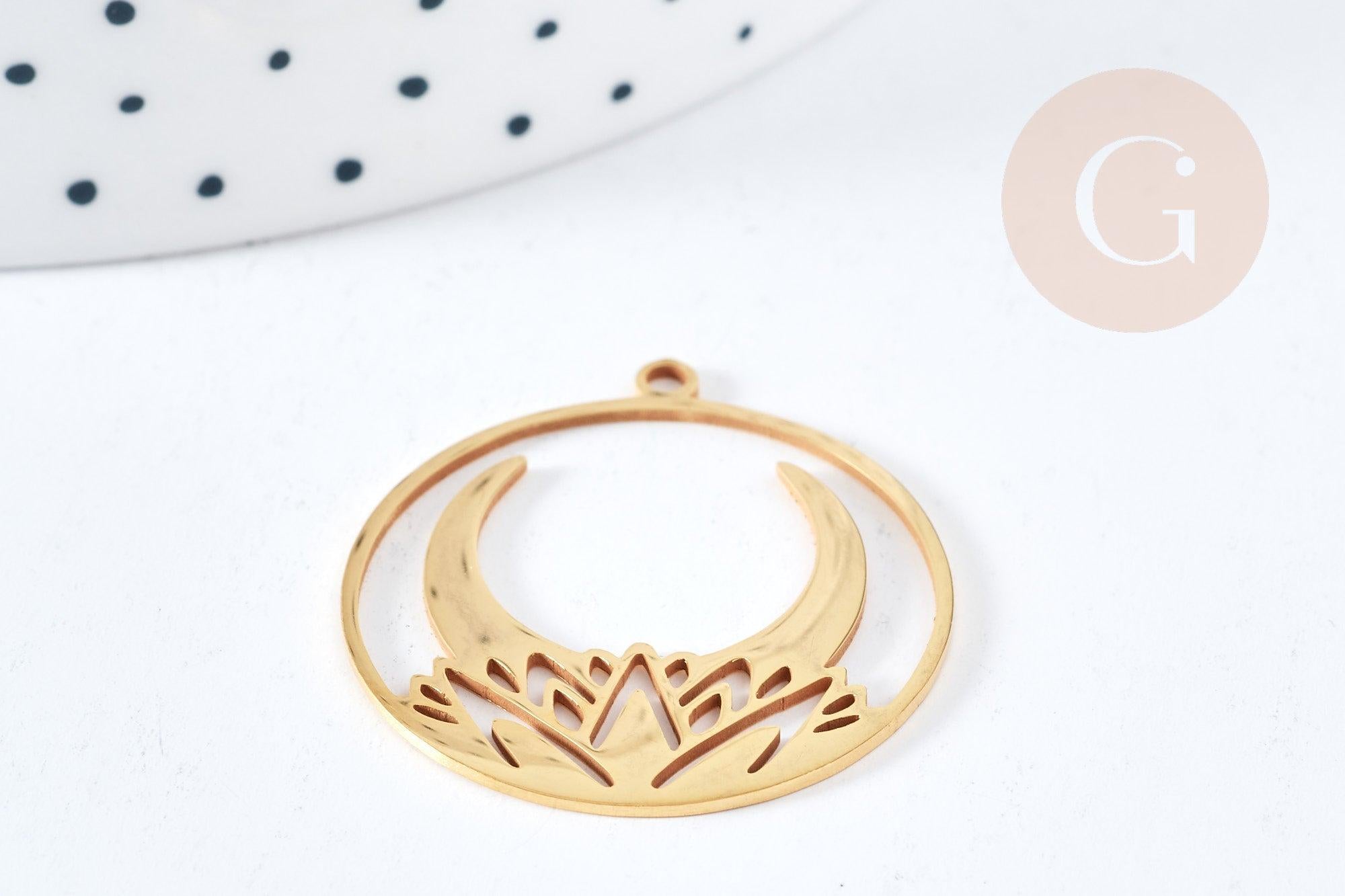 Add a touch of mystery and beauty to your jewelry designs with this beautiful 201 stainless steel gold round pendant . With its delicate design depicting a crescent moon resting on a water lily , this pendant is ideal for lovers of unique and original jewelry.