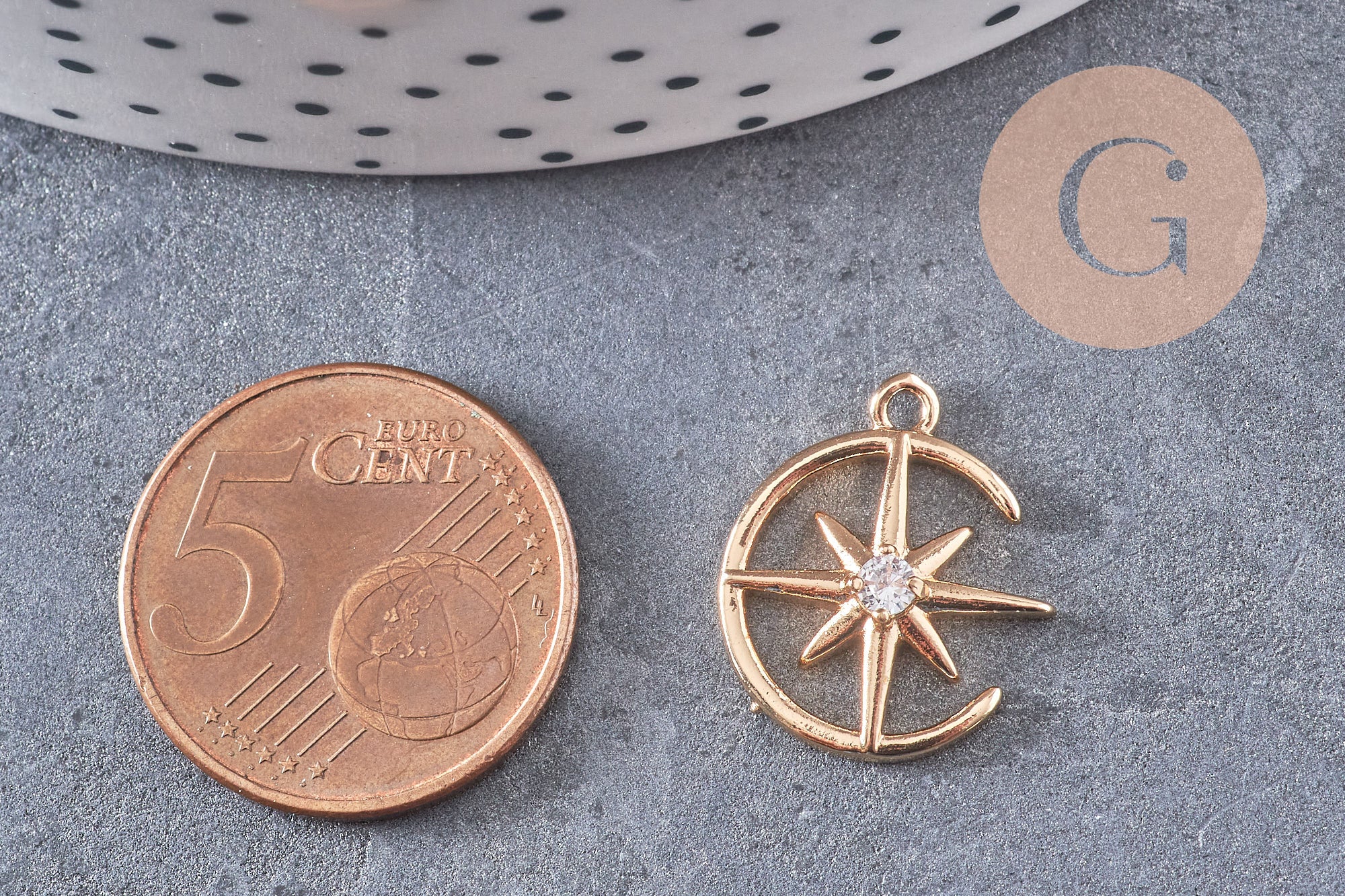 Round North Star Pendant in 18K Gold Plated Brass Zirconia 18mm, a gold pendant with crystals for jewelry creation, x1 G5514