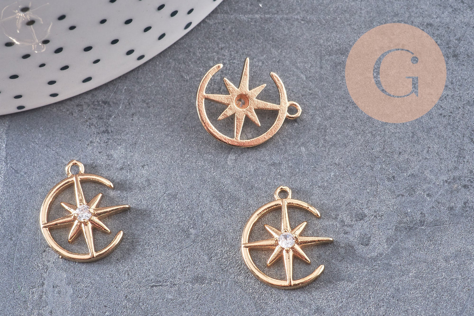 Pendentif rond étoile du nord laiton doré 18K zircon 18mm, un pendentif doré avec cristaux pour création bijoux, x1 G5514