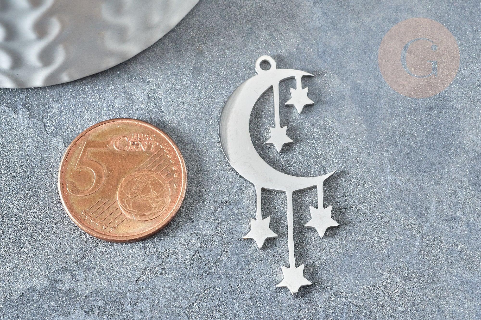 Dive into the celestial trend with this magnificent moon-shaped pendant, decorated with stars and small planets, in silver-plated stainless steel . Its fine, openwork silhouette makes it both poetic and contemporary, perfect for jewelry inspired by the cosmos.
