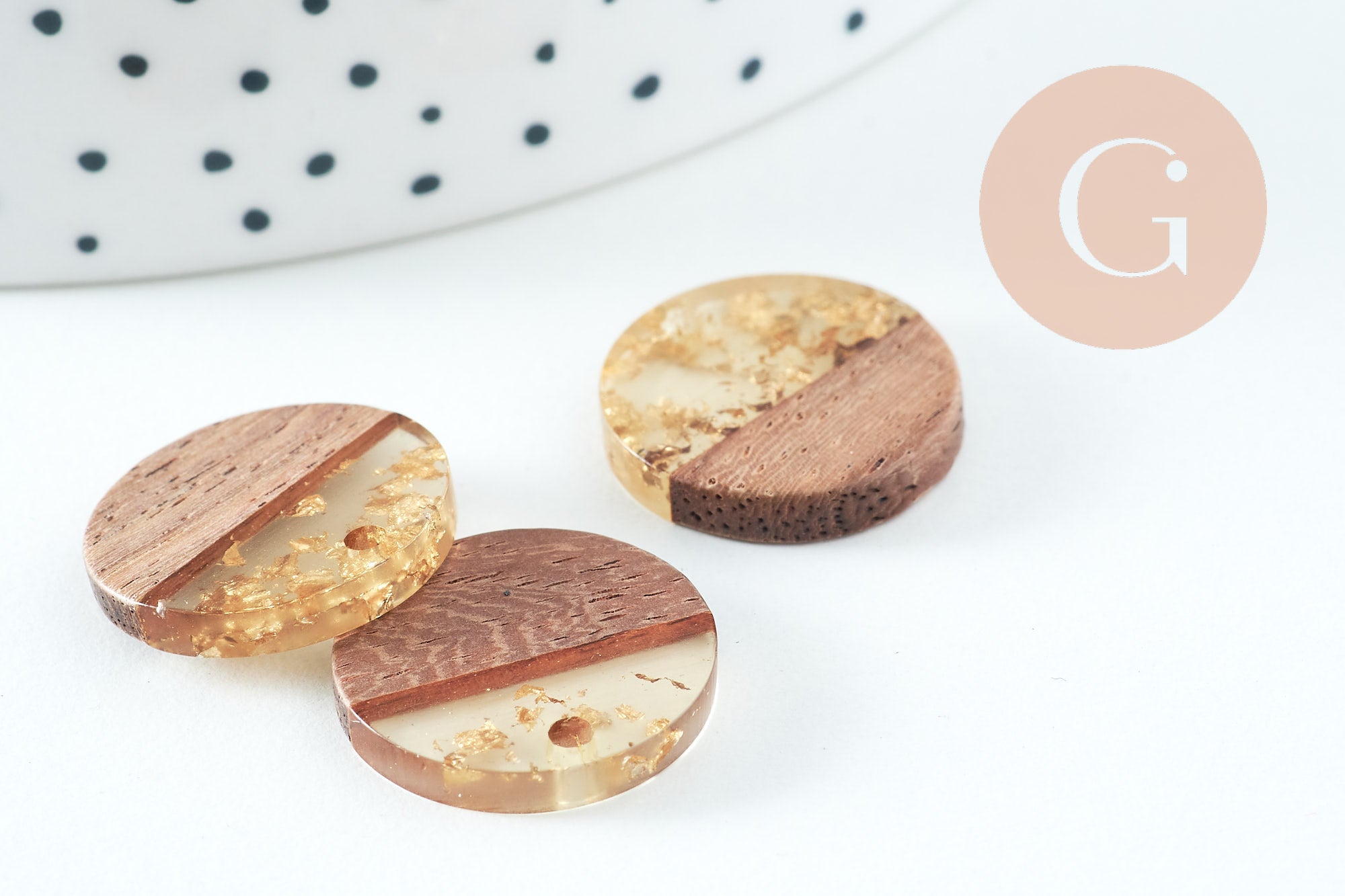 Pendentif disque bois résine paillettes, bois naturel, perle bois rond, perle ronde, bois,18mm, x5 G4540
