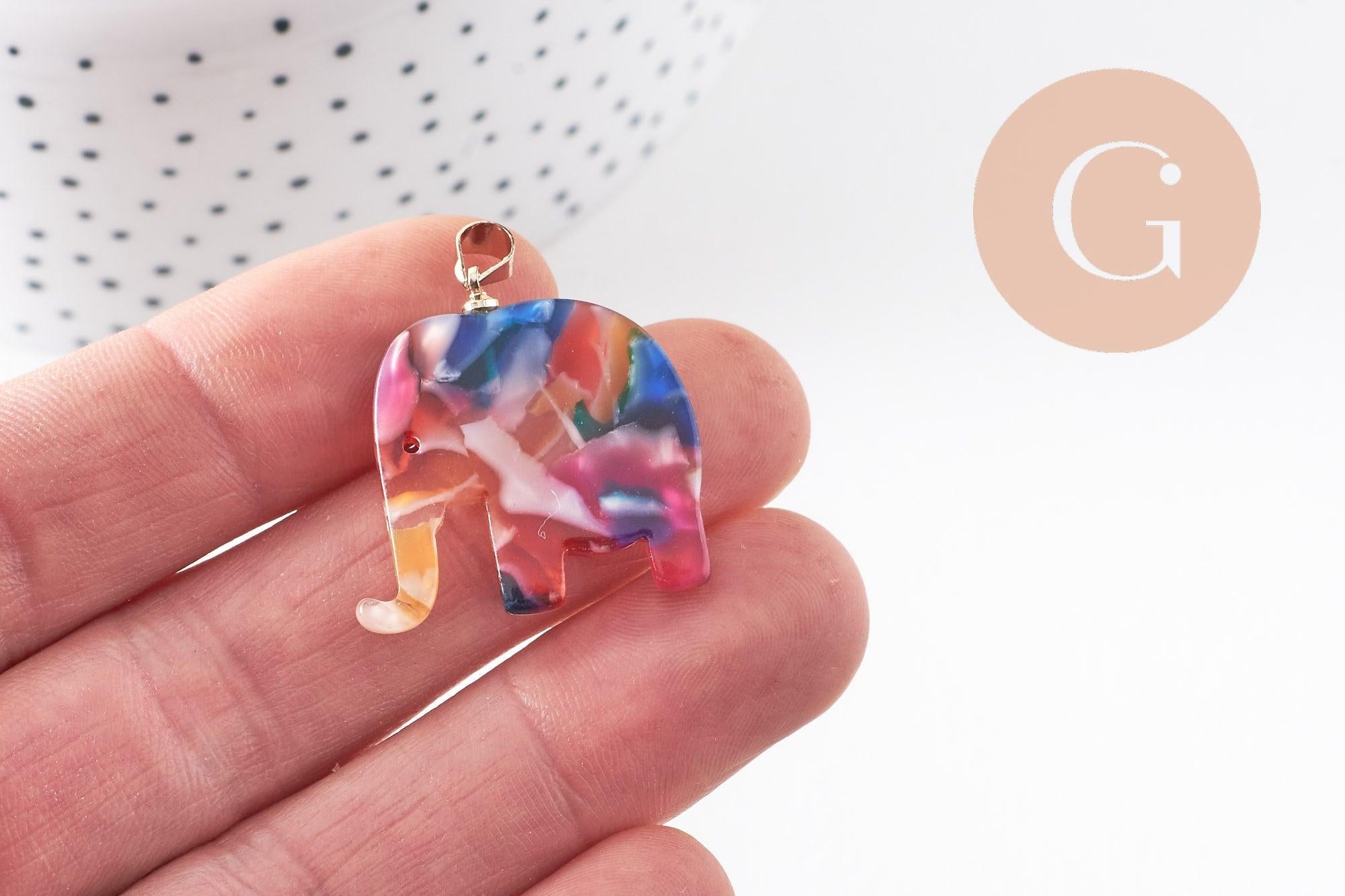 Here is an elephant pendant in cellulose acetate in multicolored tortoiseshell color to make modern and very trendy necklaces and earrings.