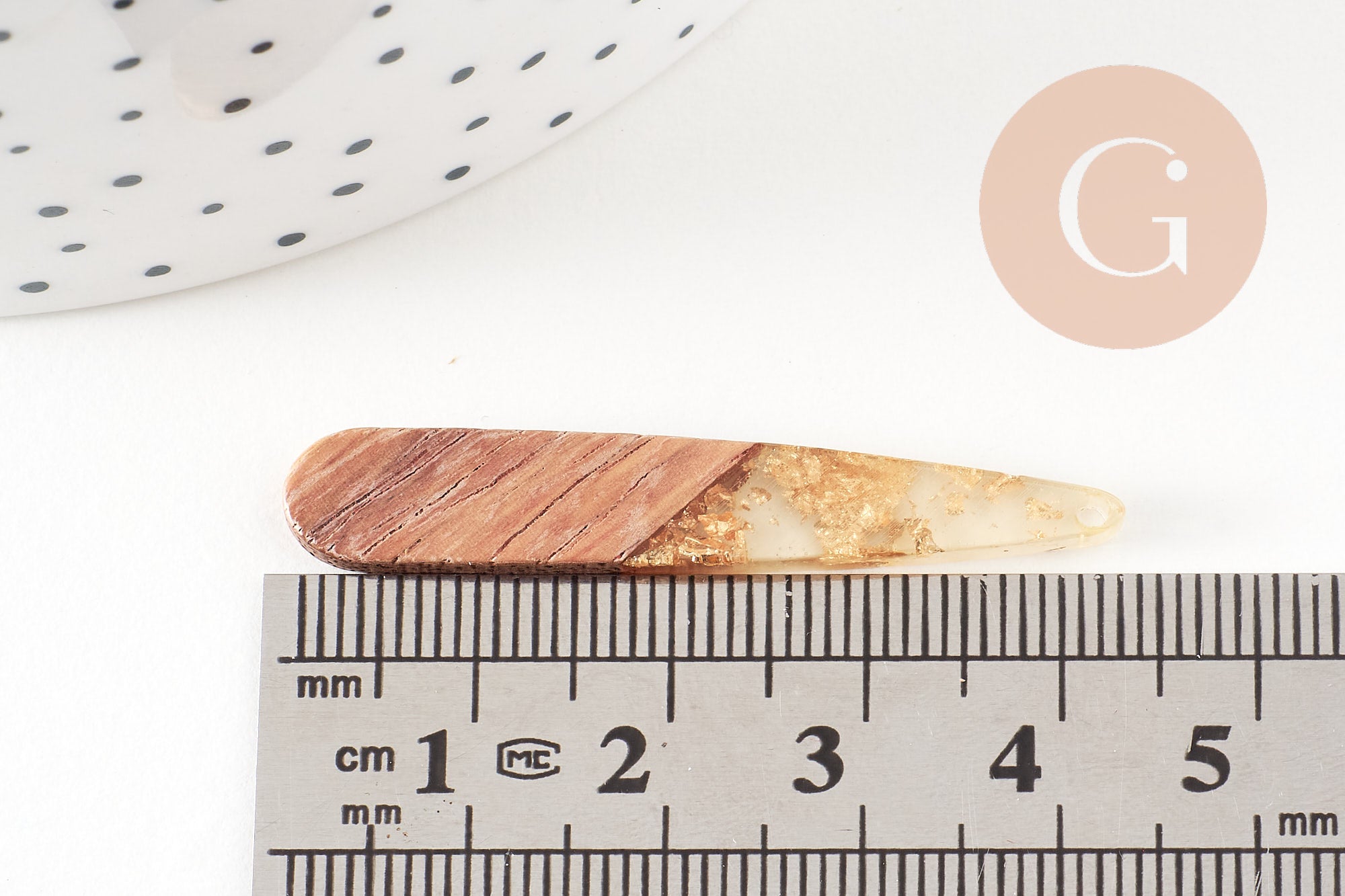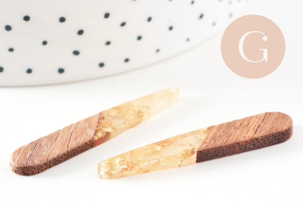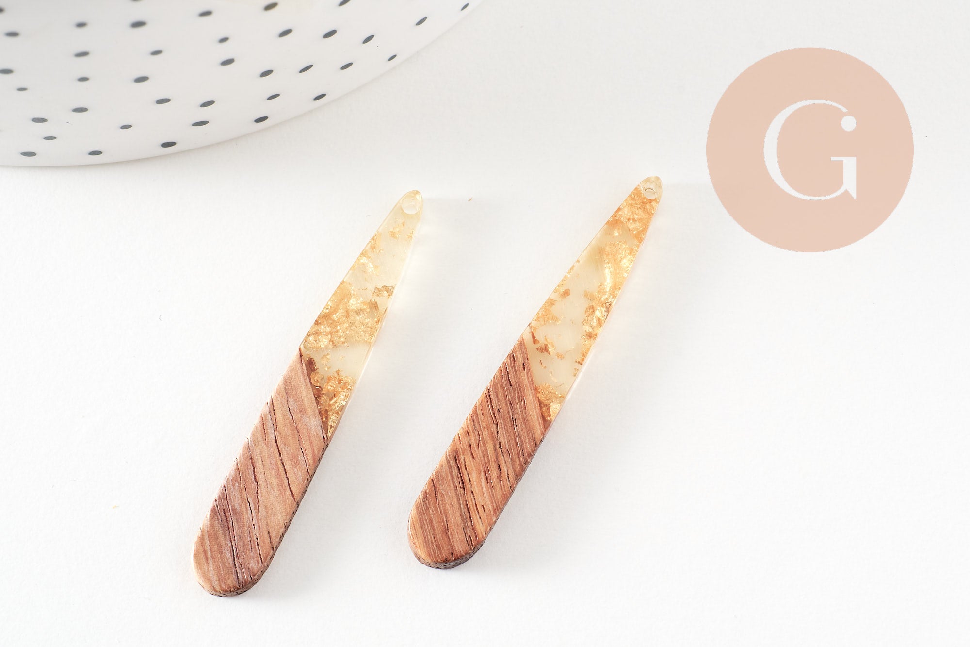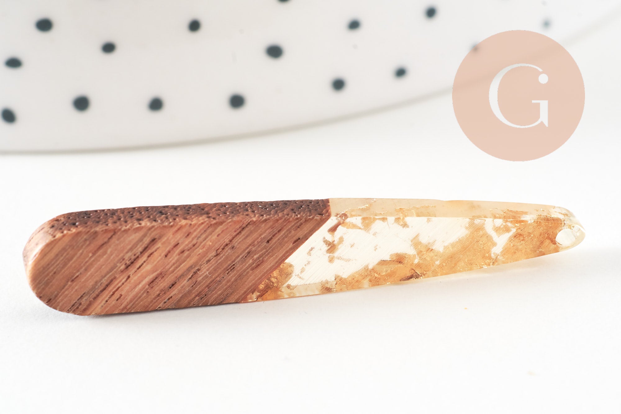 Drop pendants in wood and transparent resin and gold leaf which can make very pretty pendants or complete earrings in a geometric style.