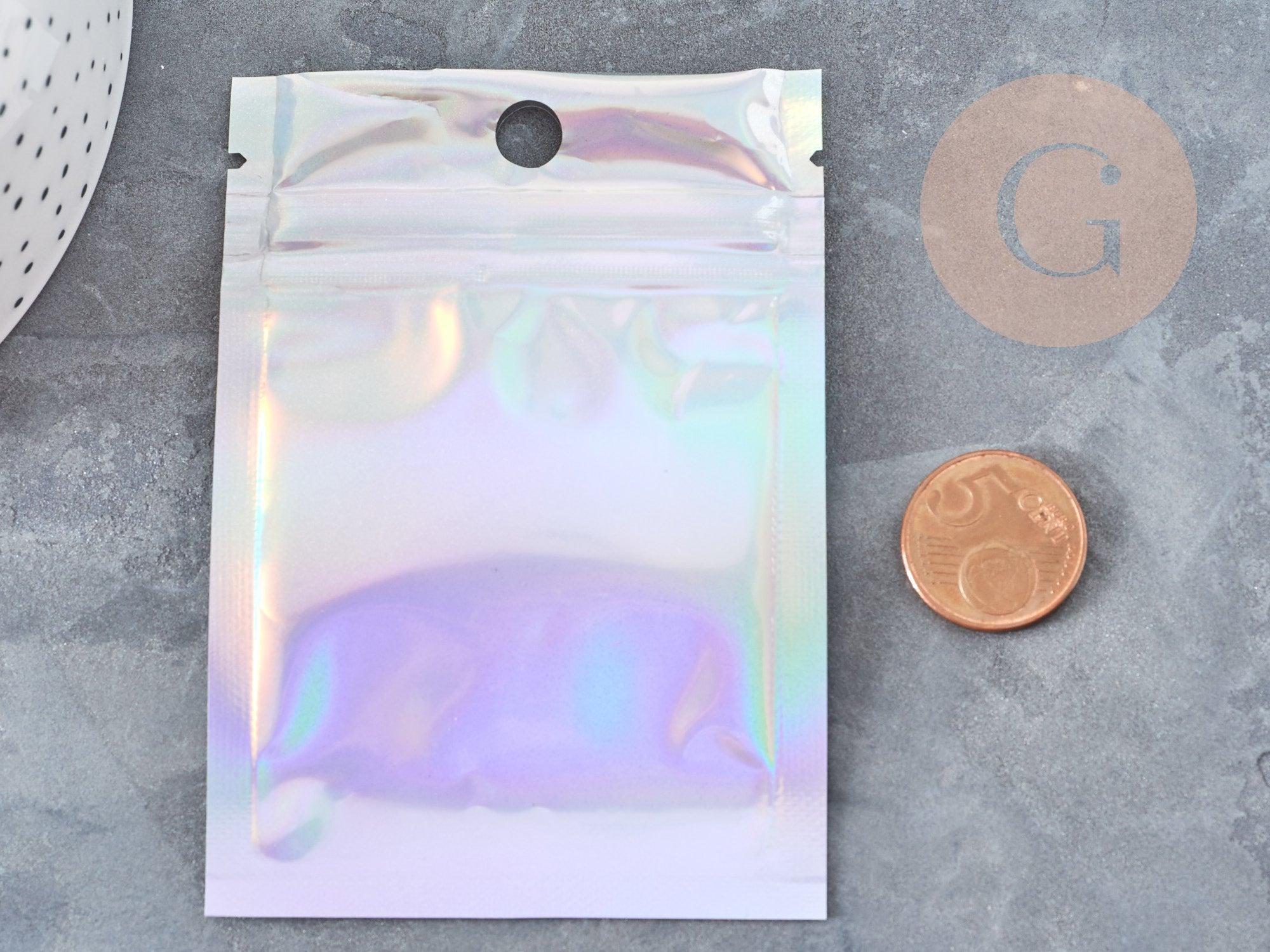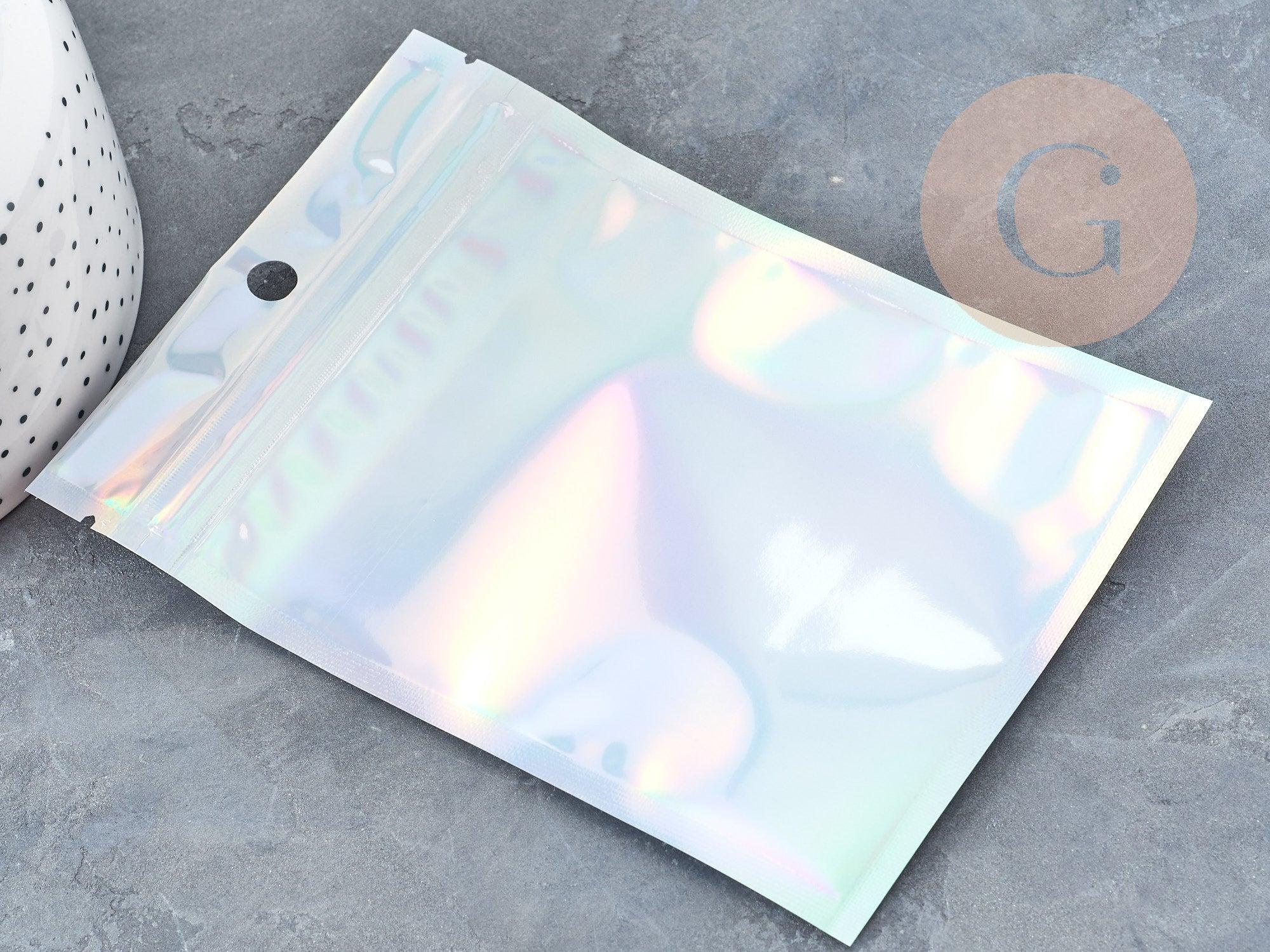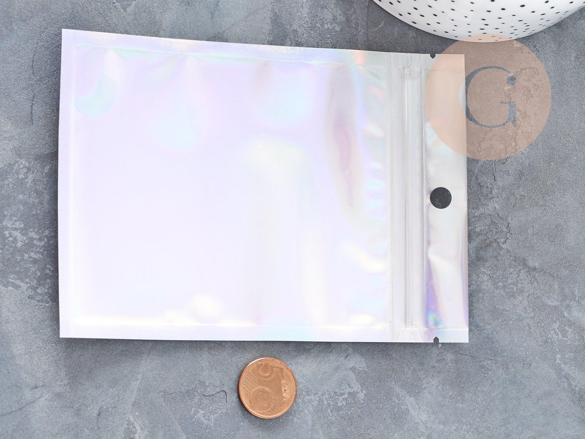 Add a touch of sparkle and elegance to your organization with this set of 5 rectangular 10x7 cm gray holographic plastic zip bags . Both functional and aesthetic, these bags are ideal for storing, packaging or presenting small precious items in a modern and professional style.