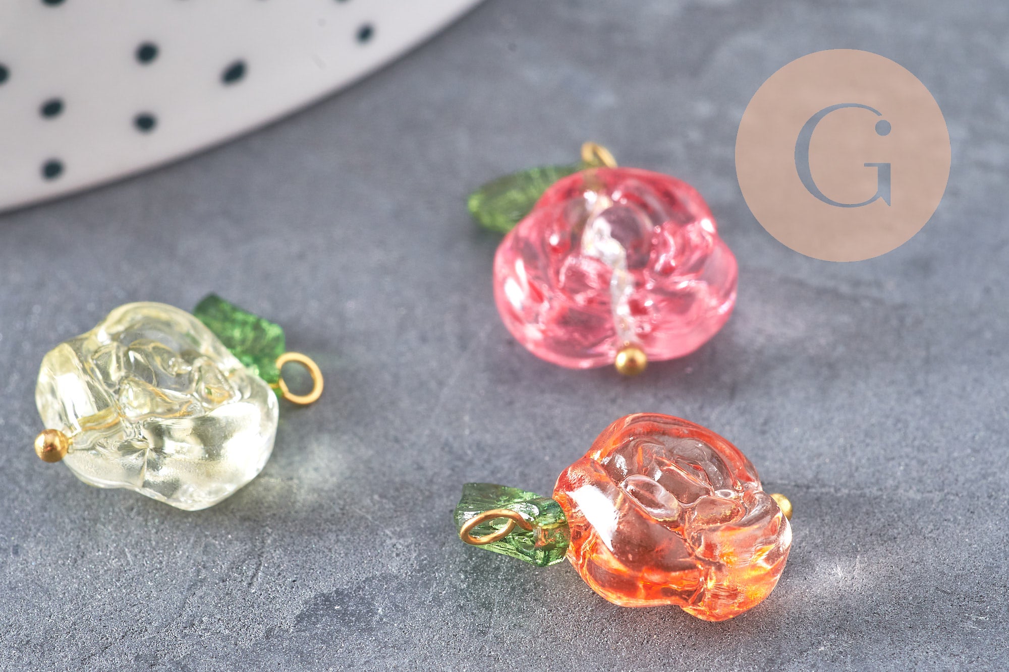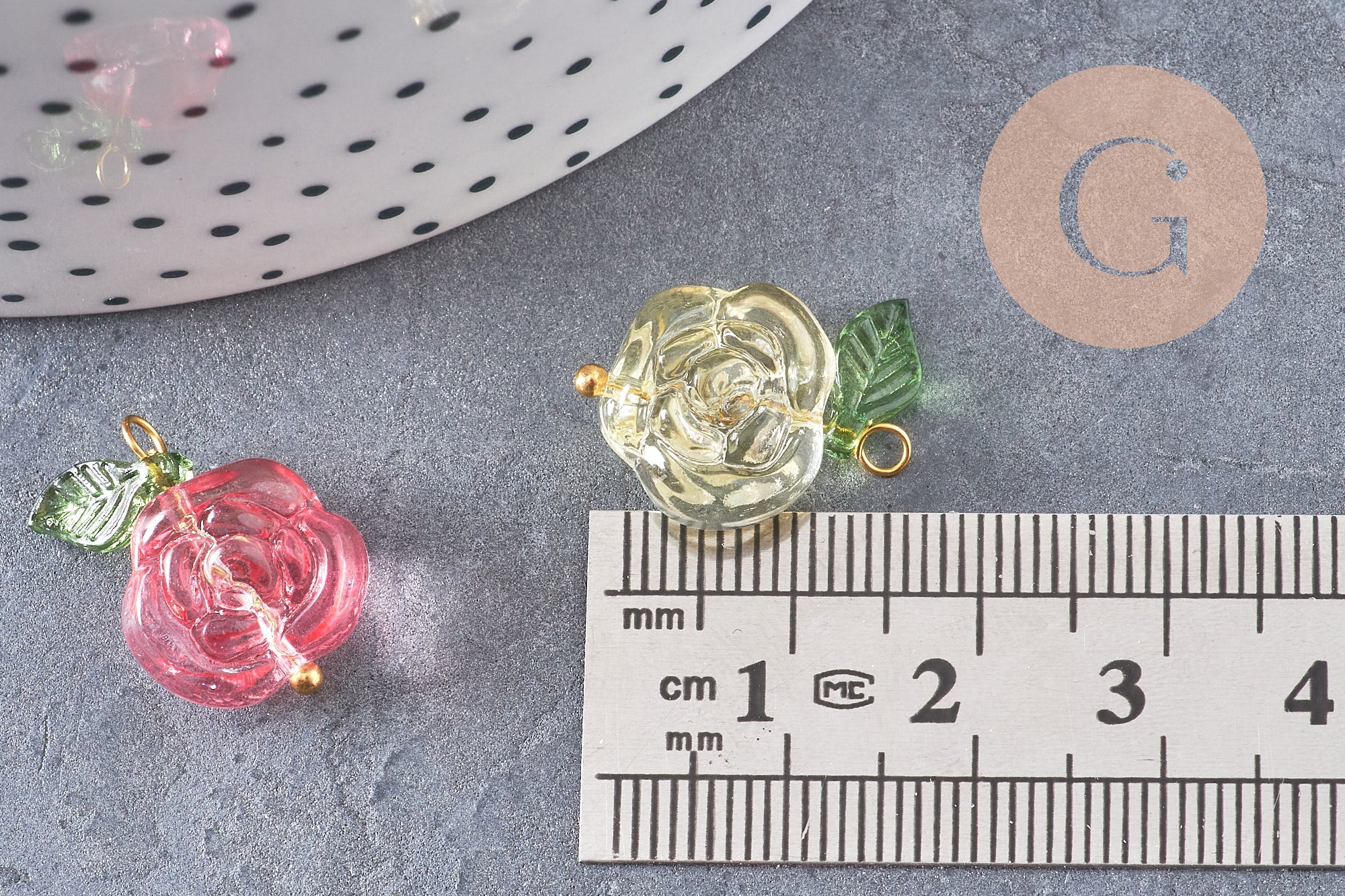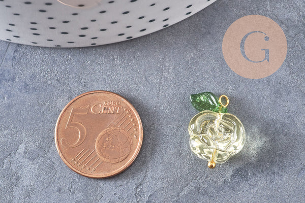 Add a colorful floral touch to your DIY creations with these multicolored glass rose charms , delicately mounted on a gold-plated brass bail and accompanied by a small acrylic leaf. Their refined and luminous design makes them perfect elements for spring and romantic costume jewelry.