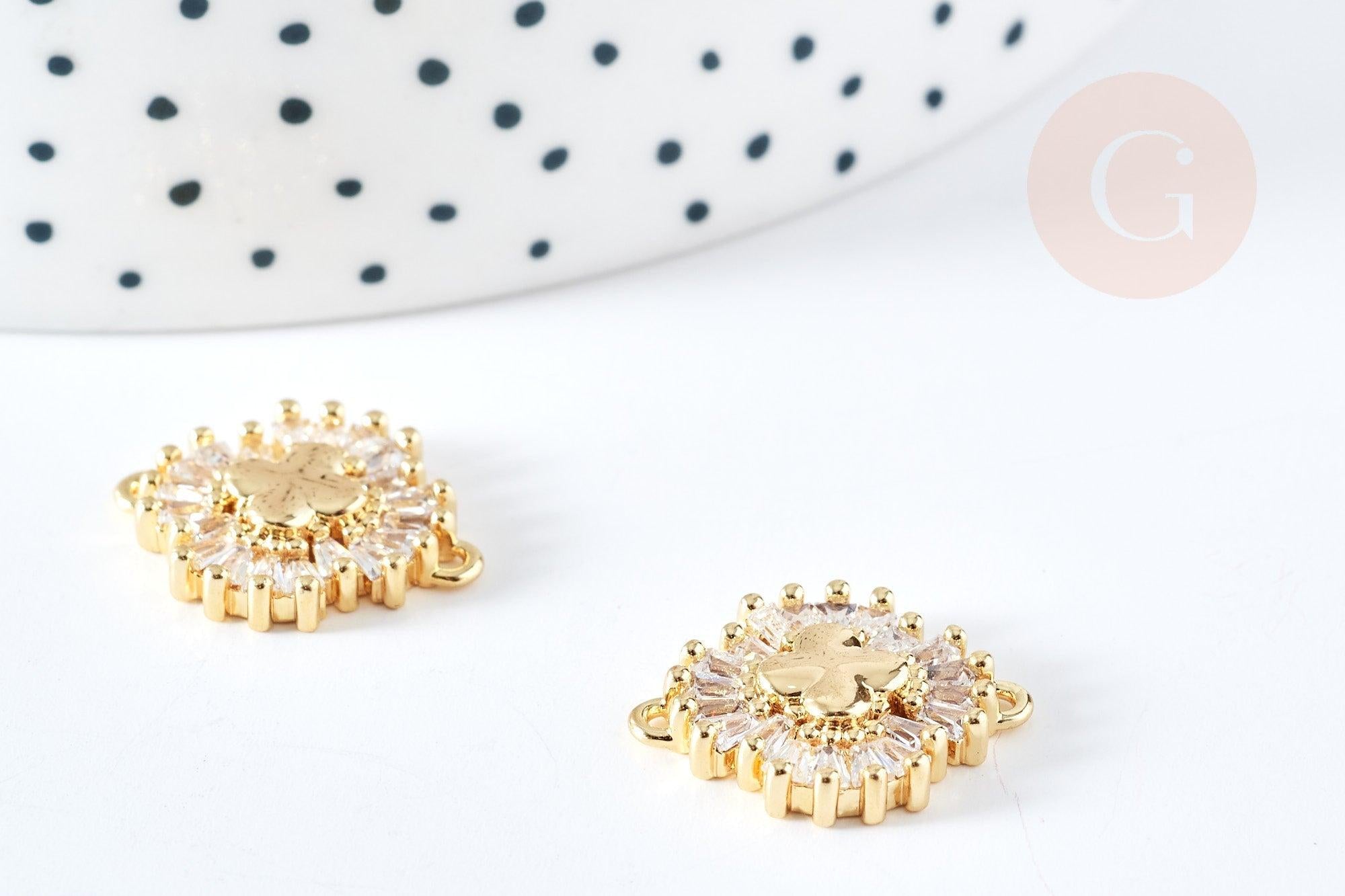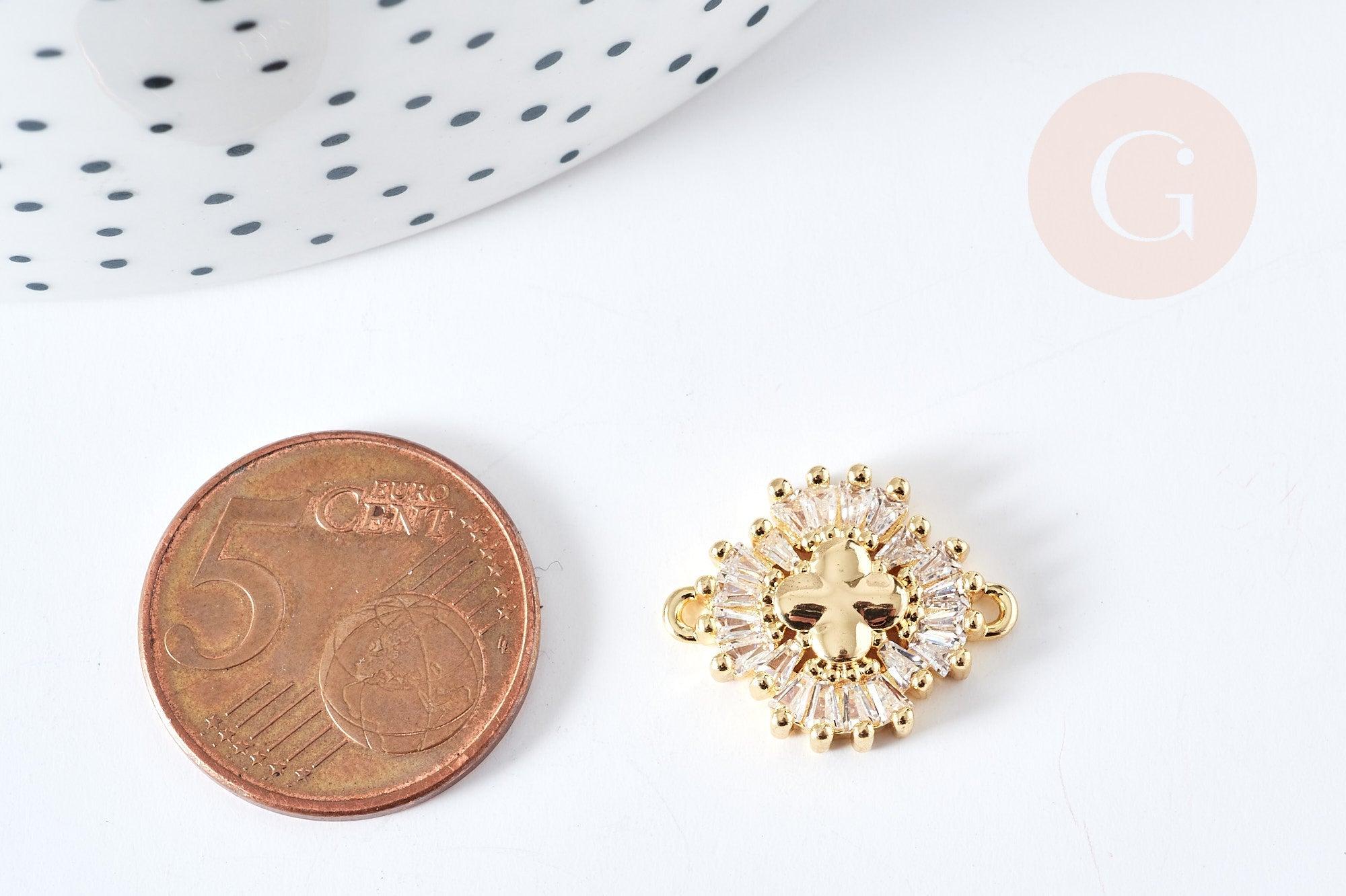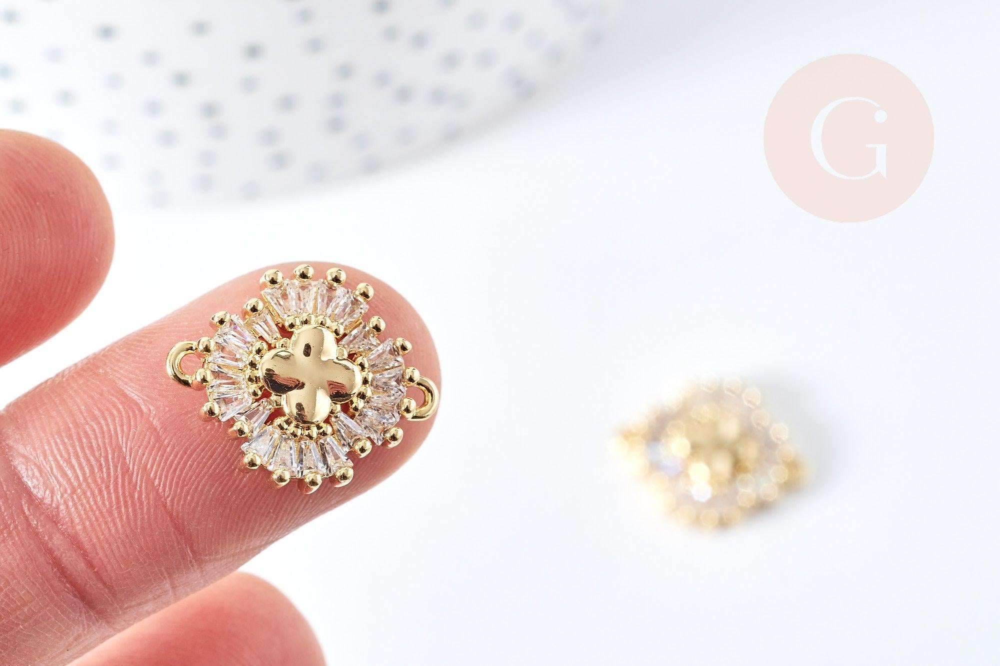 This cross connector pendant in 18K gold-plated brass and white zircon crystal is a unique piece to enhance your religious jewelry creations. Order now to add a touch of spirituality to your jewelry designs.