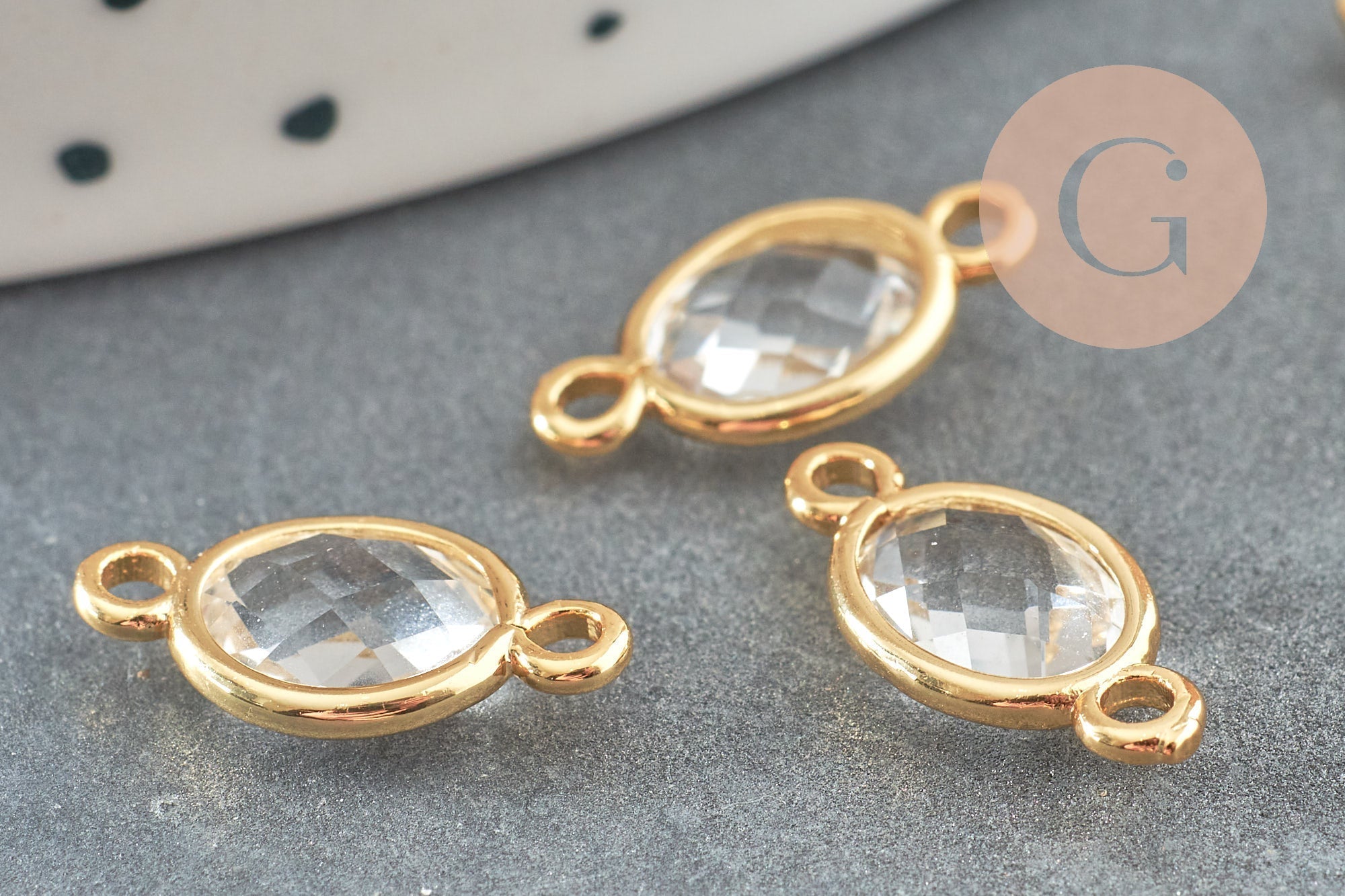 Fall in love with this pair of oval connector pendants in clear crystal mounted on a gold-plated brass base. Their elegant and refined design will enhance your jewelry creations with a precious and luminous touch.