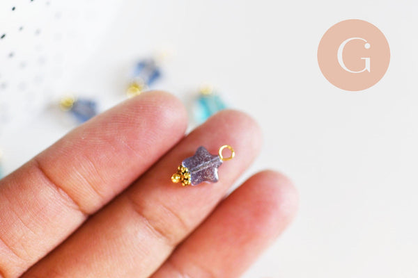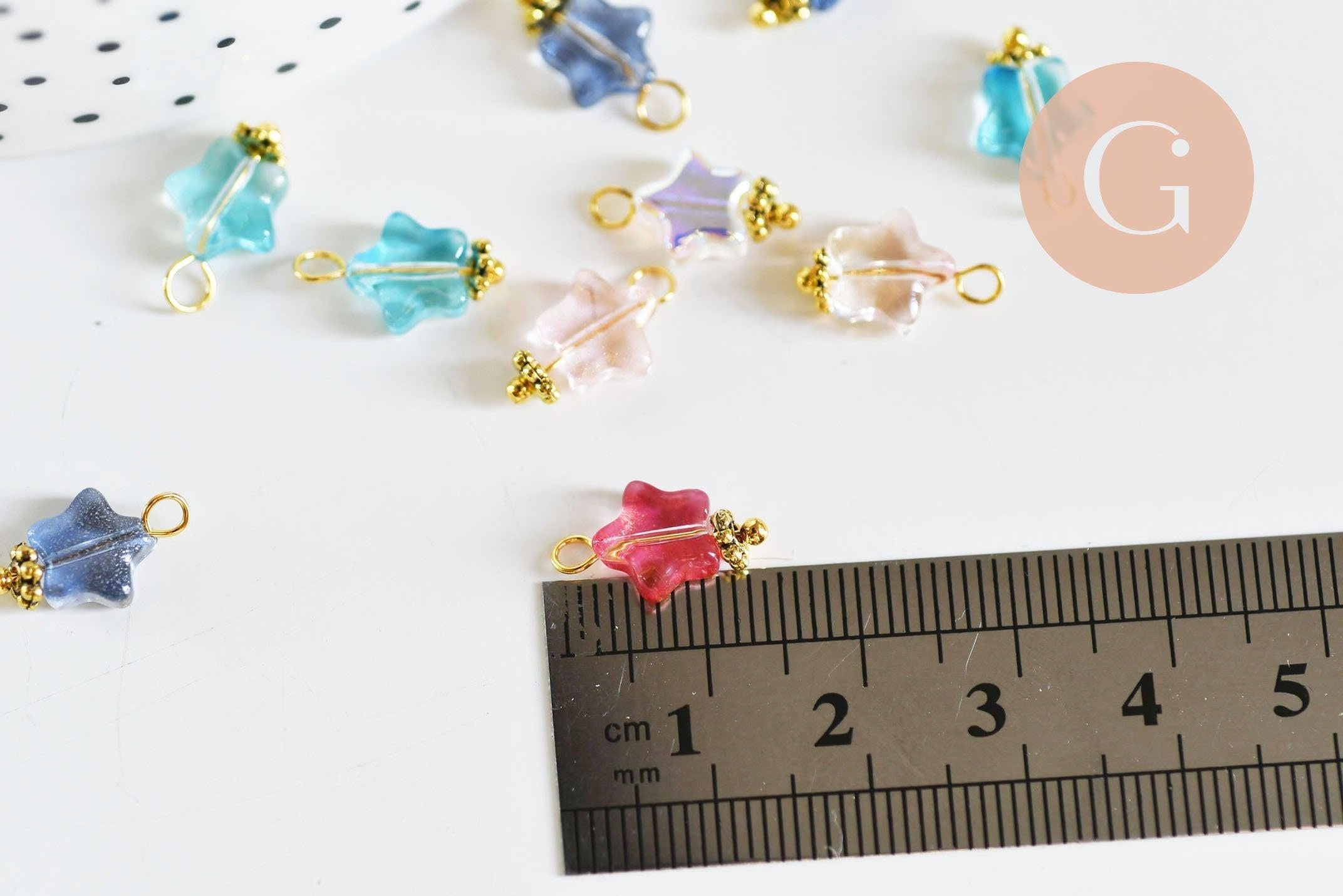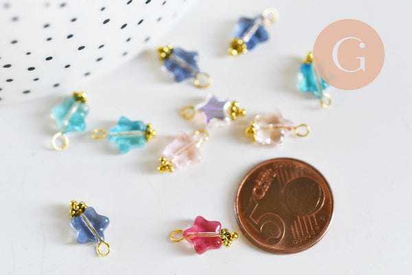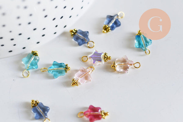 Fall in love with this pretty star-shaped pendant made of iridescent glass with colorful reflections, mounted on a gold-plated zamac bail and decorated with a small gold-plated brass bead. A luminous component for your DIY jewelry that will bring a touch of magic to your creations.
