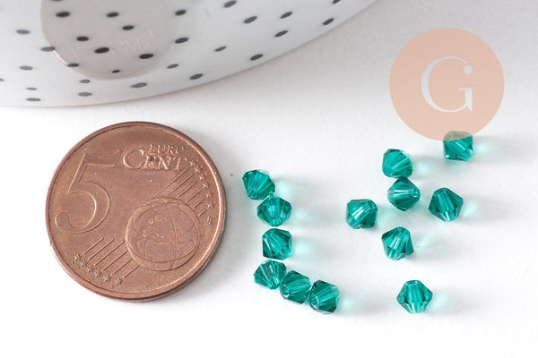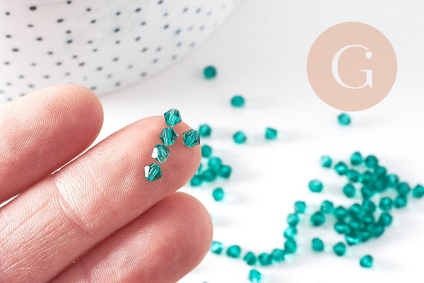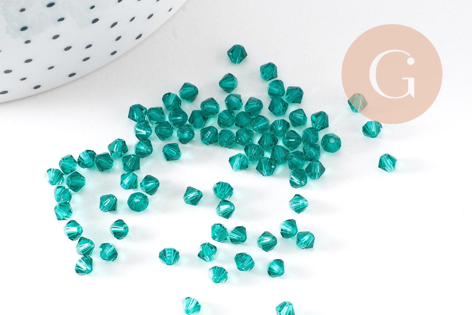 AAA-quality faceted green Austrian crystal bicone beads . Their transparency and natural sparkle will bring a touch of freshness and elegance to your costume jewelry creations. Perfect for spring or plant arrangements.