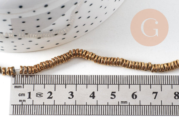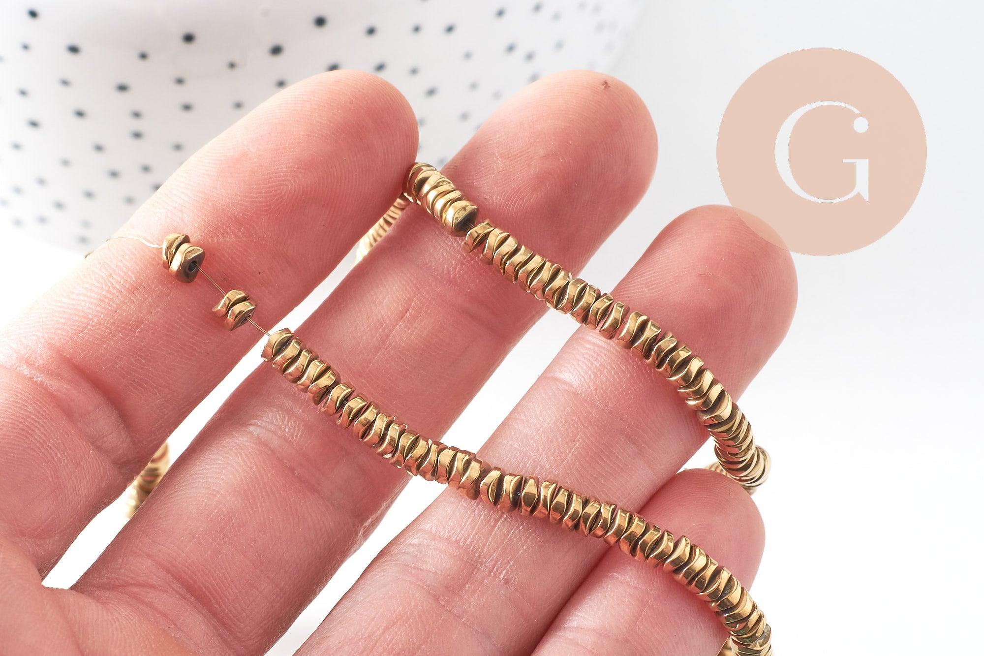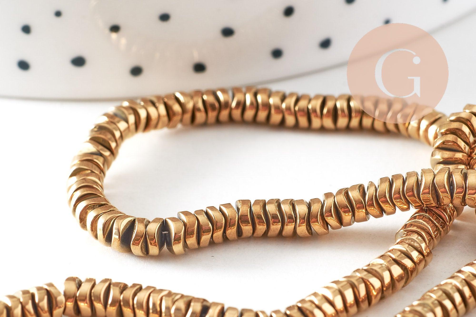 Fall for these synthetic 18K gold hematite beads , a fine stone with a great effect.