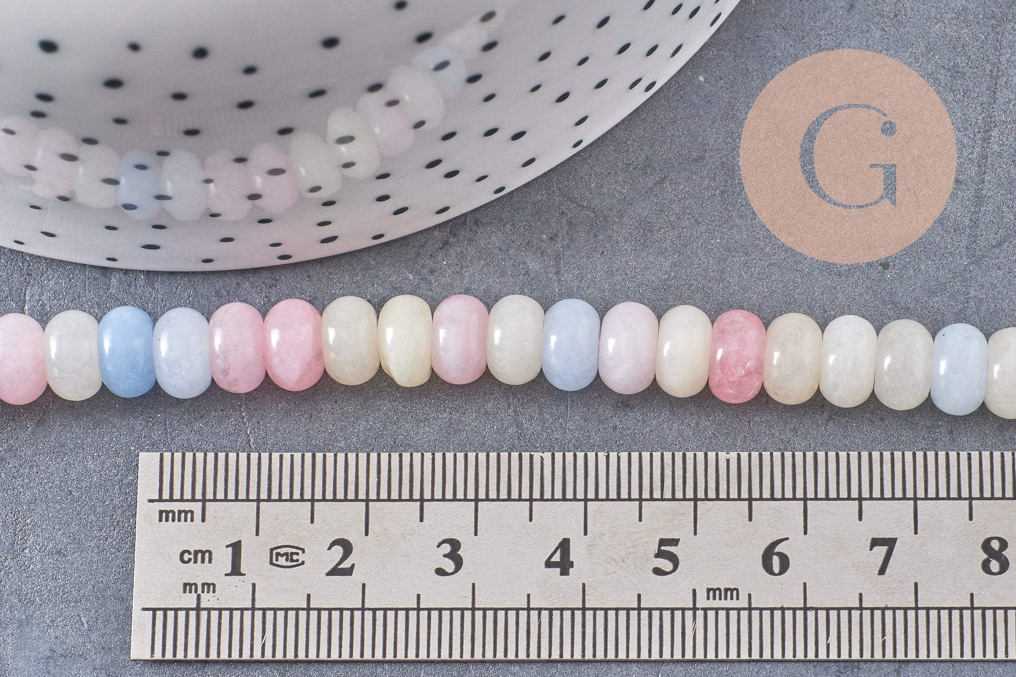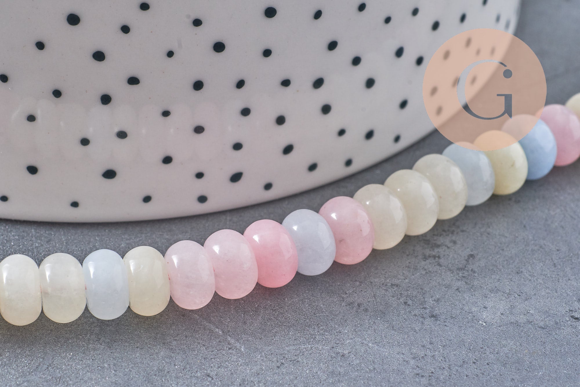 Each strand includes approximately 74 beads of 8x5mm , in varied and harmonious shades (soft pink, lilac, mint, soft yellow, pale blue…).