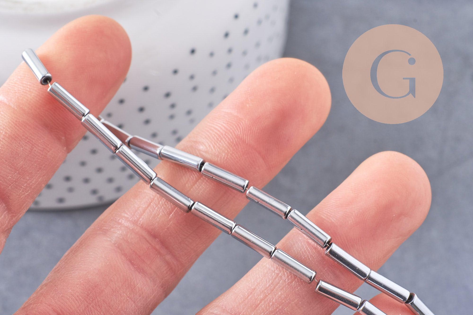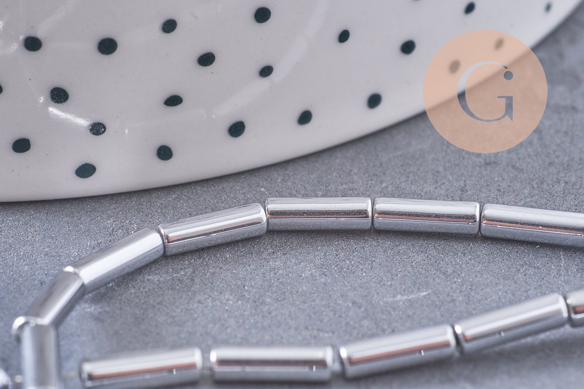 Fall in love with these silver-plated synthetic hematite tube beads : an elegant and durable alternative to traditional metal beads. Their silvery shine and sleek shape will bring a modern and refined touch to all your costume jewelry creations.