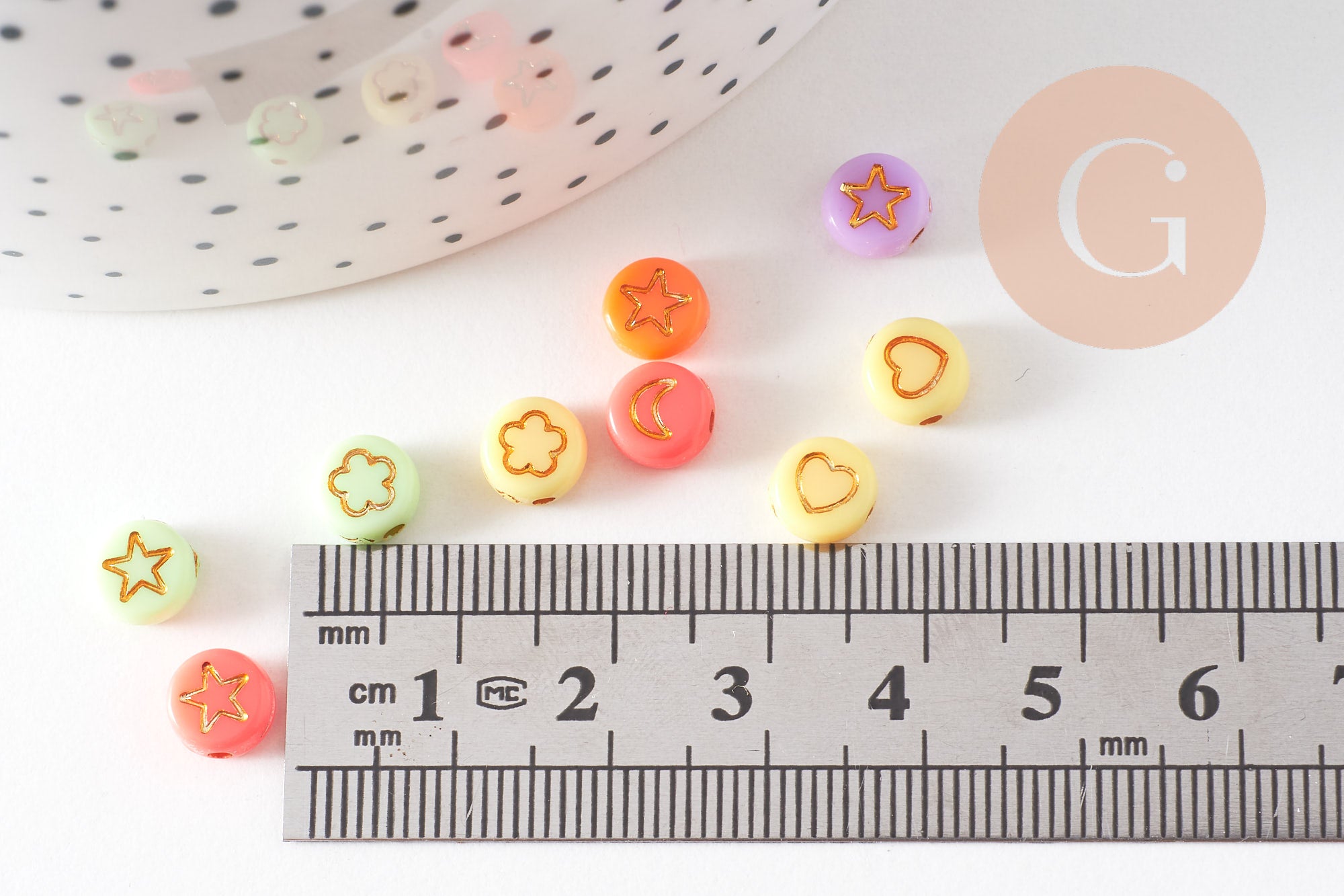 Add a playful, sweet, and colorful touch to your creations with these round, pastel-colored plastic beads featuring pretty gold symbols. Moon, stars, flowers, or hearts: each bead is a perfect surprise for joyful, childlike, or retro jewelry.