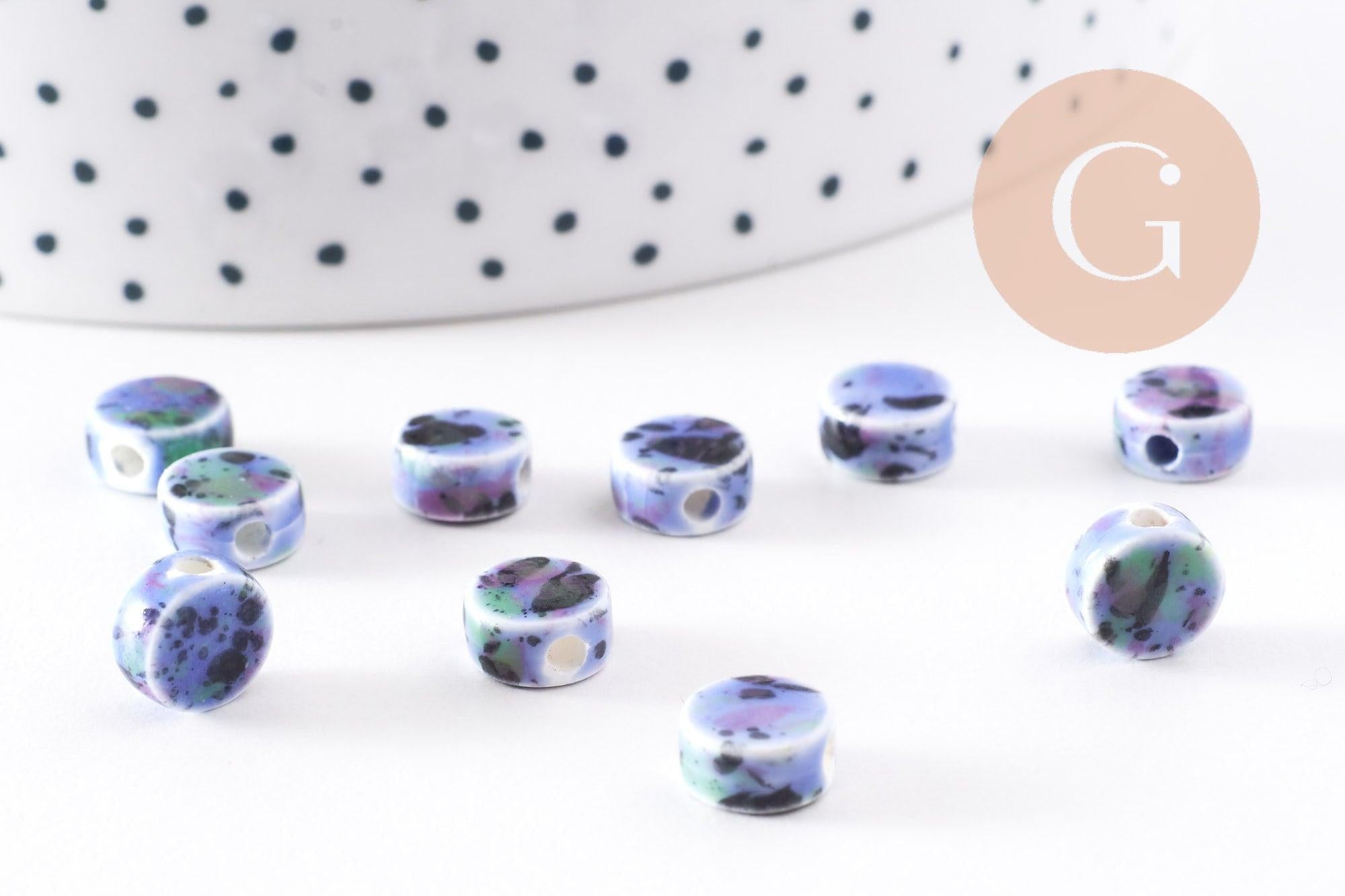 A set of 10 light blue enameled porcelain disc beads speckled with black/green/blue enamel