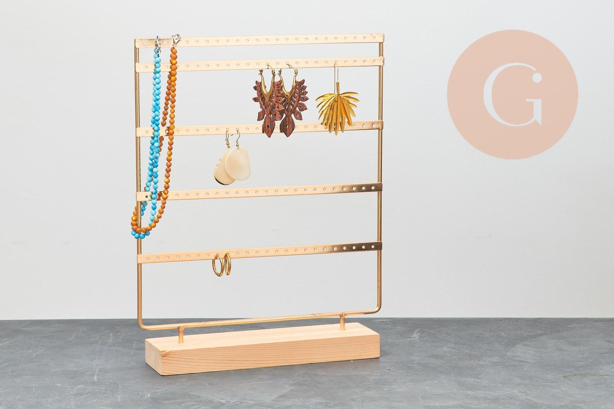 Showcase your jewelry with this stunning gold-plated brass jewelry stand, mounted on an elegant wooden base . Ideal for displaying your earrings, bracelets, and other jewelry, it combines aesthetics and practicality.
