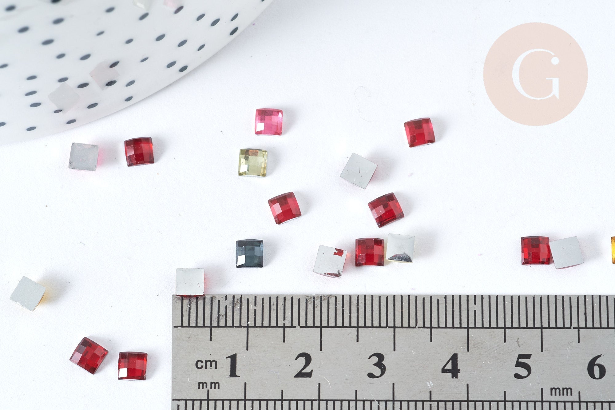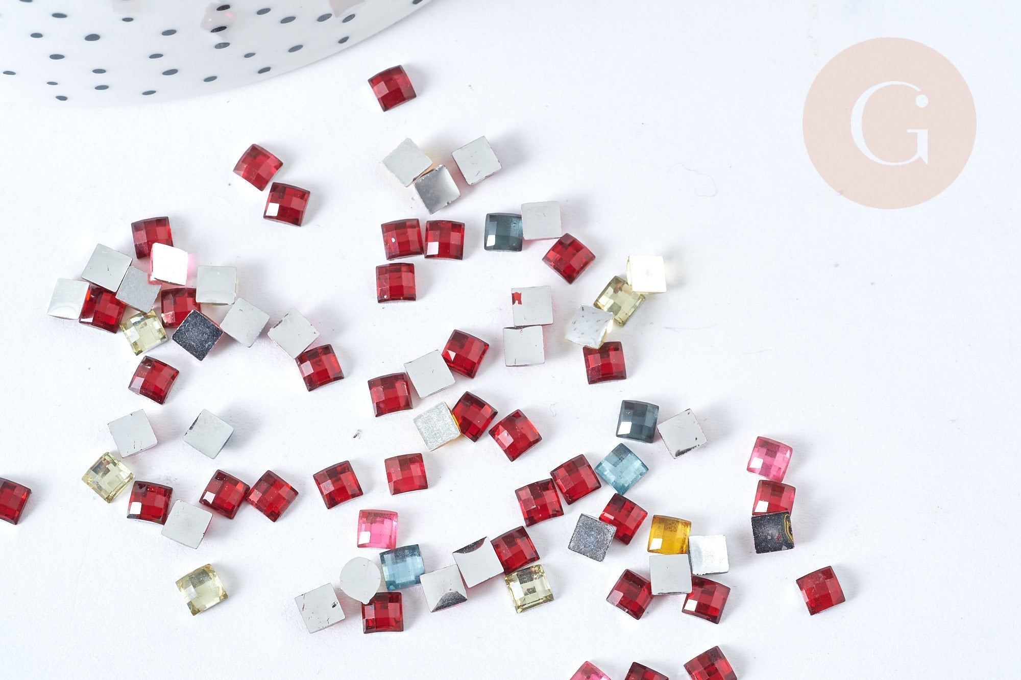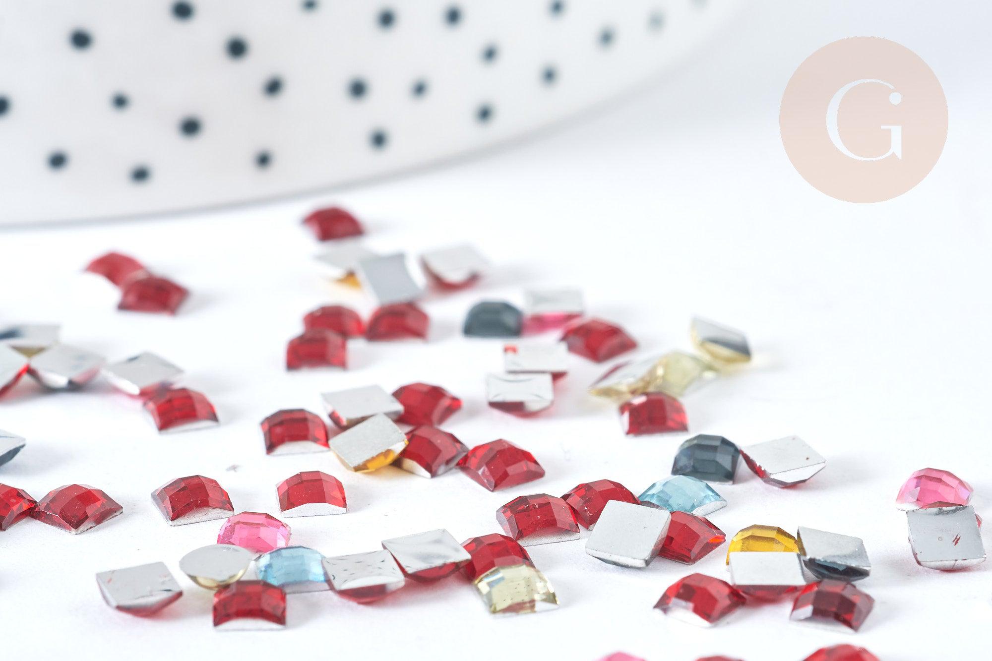 Express your creativity and personalize your clothing and accessories in textile or soft leather with this set of 5 grams of multicolored square plastic rhinestone cabochons.