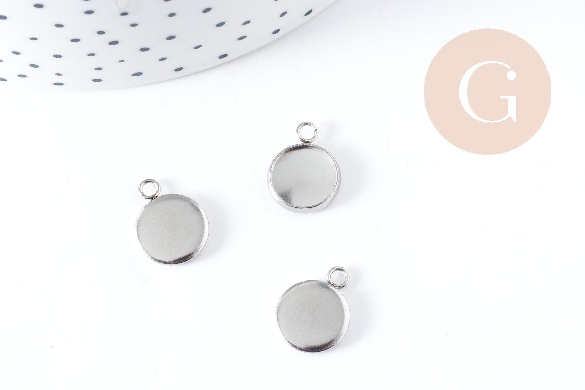 To create your own custom pendants from resin or round stone cabochons, use this round stainless steel bezel pendant with a silver finish . Its minimalist rim will delicately highlight your 15mm diameter round cabochons.