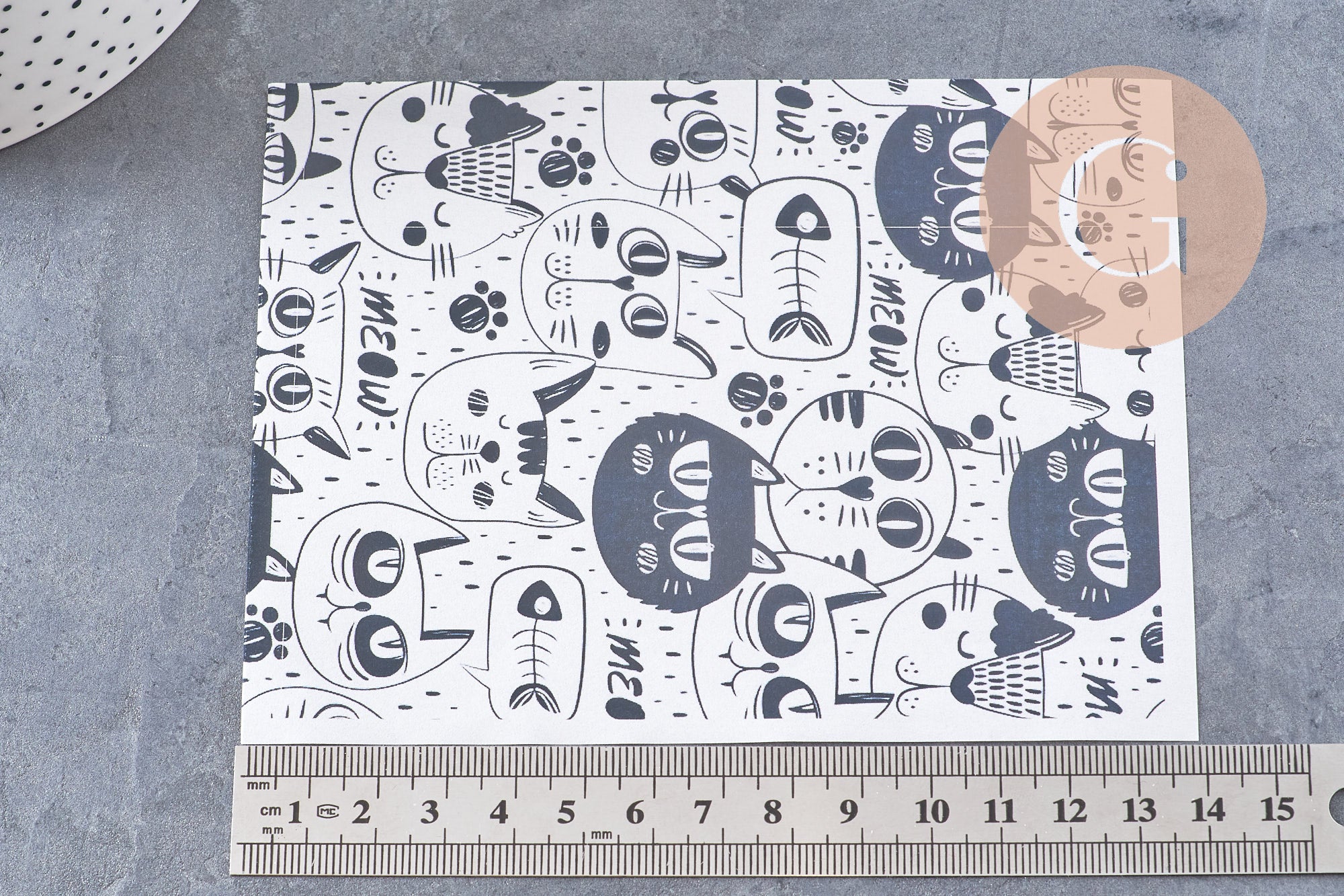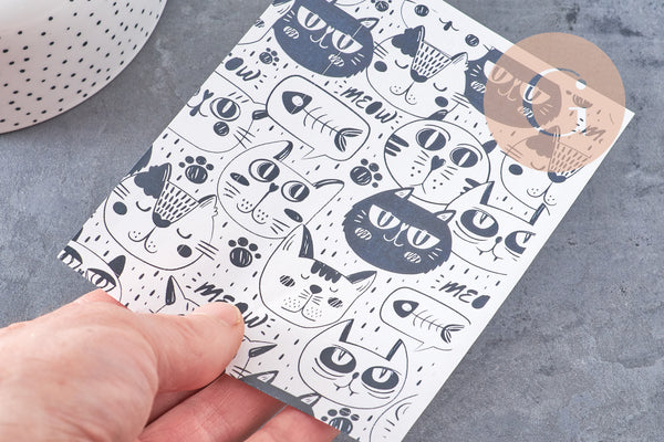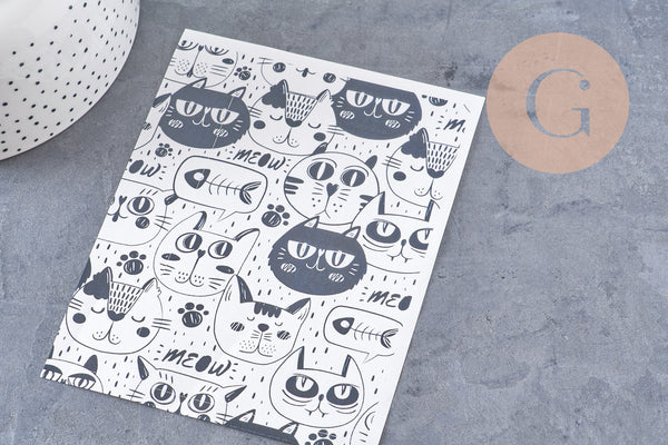 Add a fun and original touch to your creations with this polymer clay transfer sheet . Its fun pattern of cats, fish skeletons and “MEOW” inscriptions in black and white is perfect for making fun and unique costume jewelry.