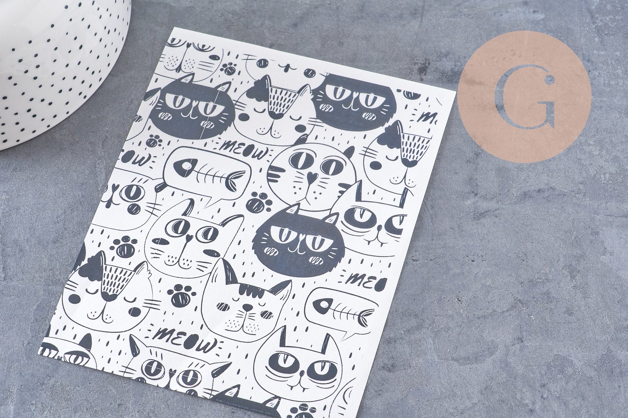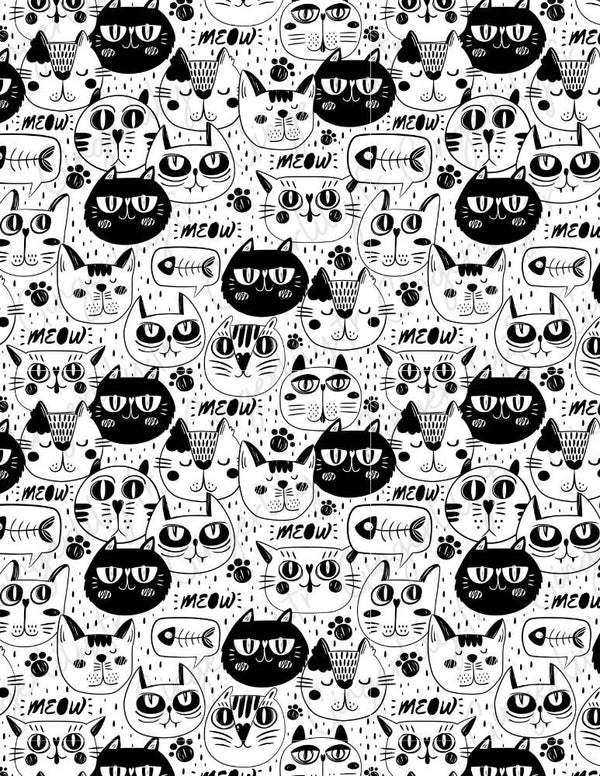 • Pattern: cats, fish skeletons, “MEOW” text (black & white)